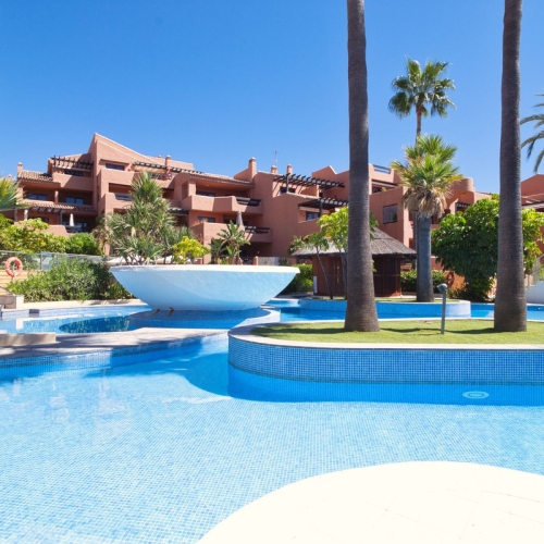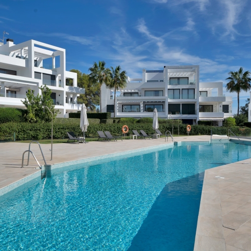 Modern apartment located in the charming village of Cancelada in Estepona. The garden apartment consists of a bright lounge and dining area have access to a private wouth facing terrace of 18 sqm and a garden of 30 sqm. The open plan kitchen is fully equipped with top range appliances. The 2 bedrooms have en-suite bathrooms and fitted wardrobes. The complex is gated with security services and concierge and has 2 swimming pools, kids pool and play area. Few minutes walking to shops, restaurants and services and only 5 minutes by car to the beach and Los Flamingos golf course.