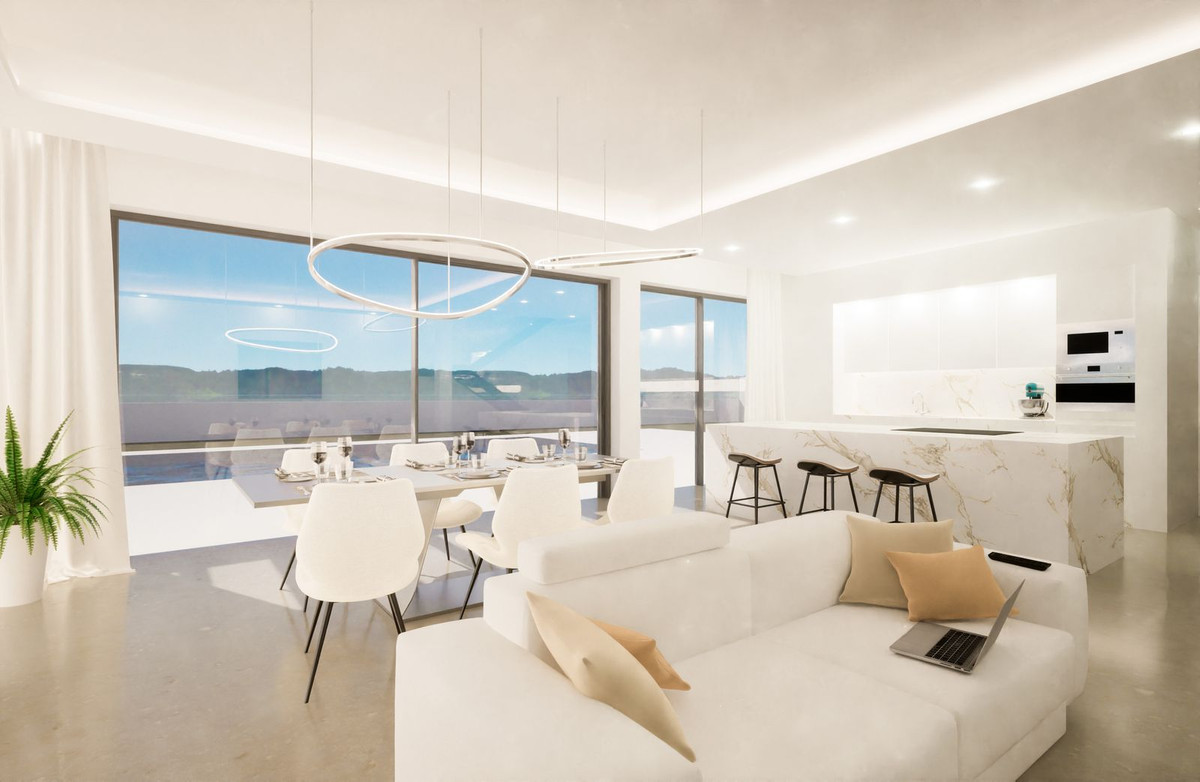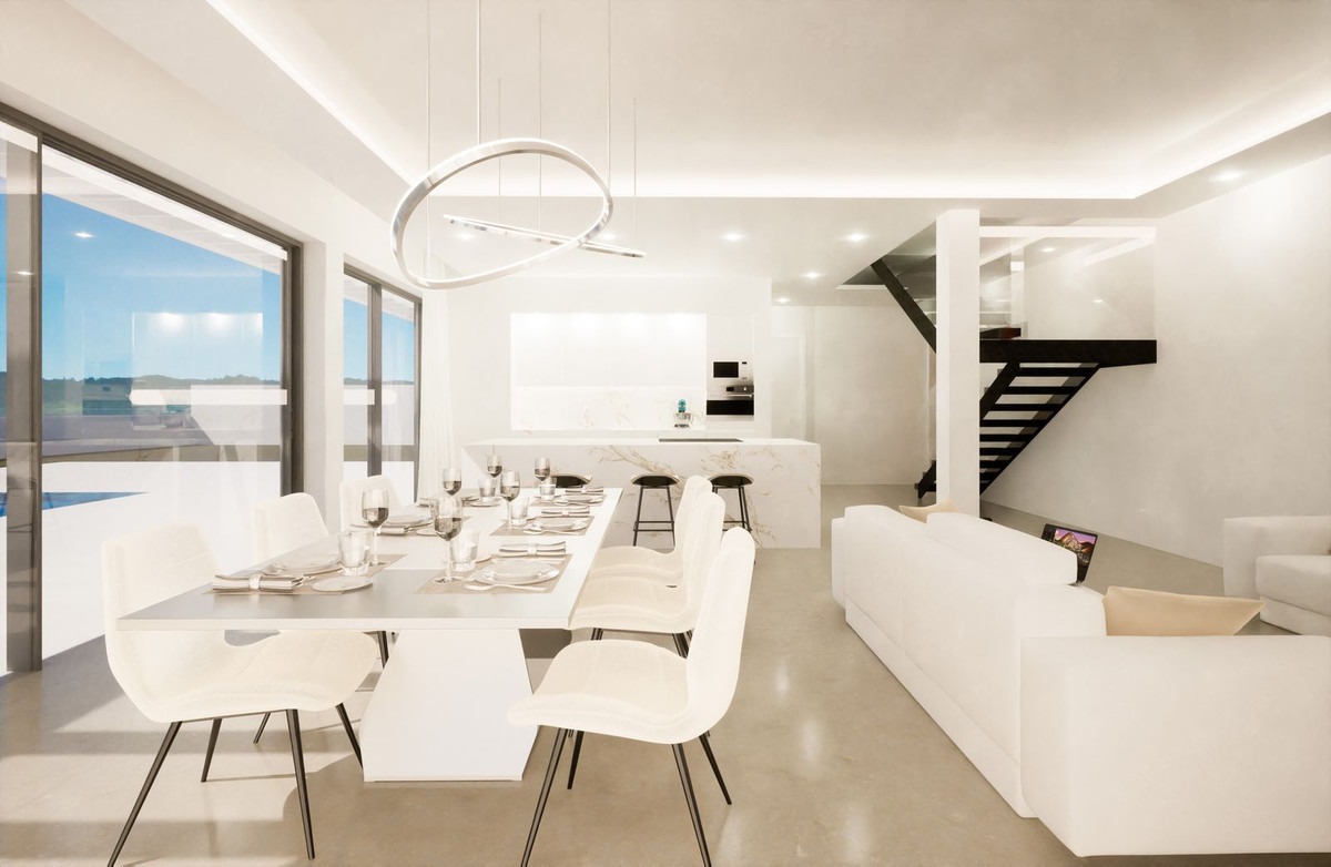 The entrance of the villa opens into a spacious entrance hall with wardrobes, leading to the spacious living room with open plan kitchen with an integrated kitchen island. Large floor-to-ceiling energy efficient windows give you direct access to the pool and the garden area. There is also a guest toilet on the ground floor.