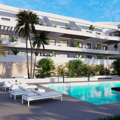 An exclusive resort of 70 penthouses with large terraces, 2 and 3 bedrooms, and 2 detached villas with 3 bedrooms, garden and a private pool.