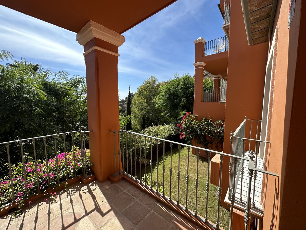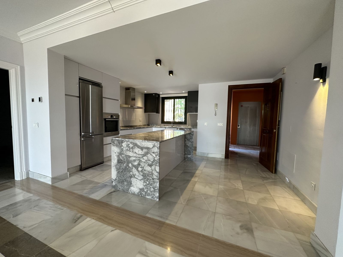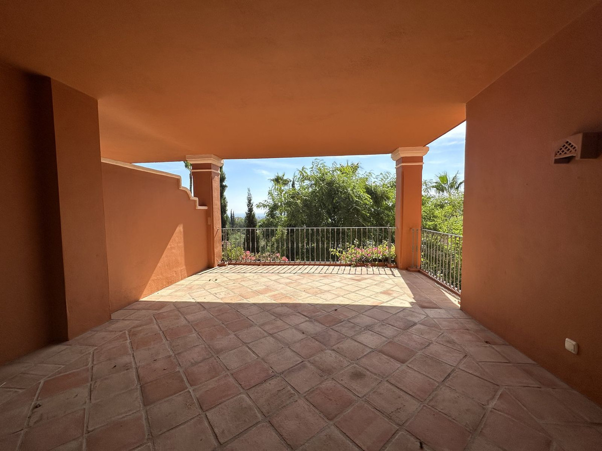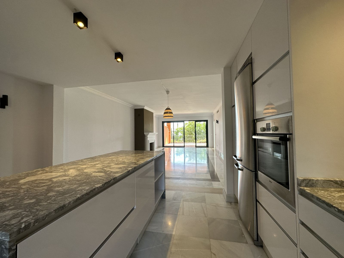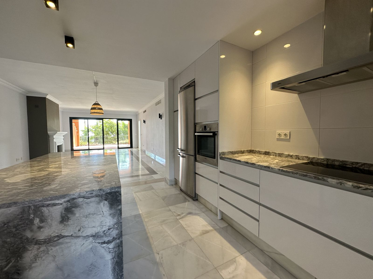 The south-west facing apartment in Benahavis comes with a large and secure underground parking space which is accessed via the elevator which arrives right outside the front door of the home. Opening the front door, a very welcoming and clean open space is the first impression, with the cleverly reformed kitchen space which has been opened up to integrate the living and dining areas with it in an American style. This allows for the maximum usability for families who wish to prepare food, eat and relax together. Further to this is the lovely private terrace. Here, doing and relaxation can be carried out with total privacy and views to the hills that roll down to the west coast of Marbella.