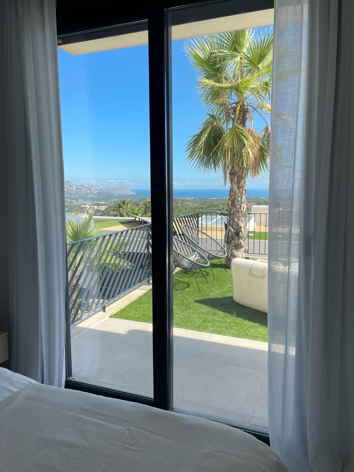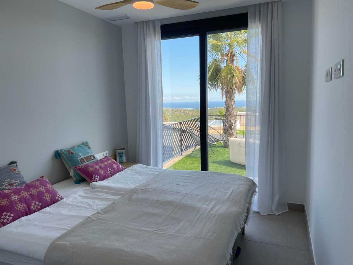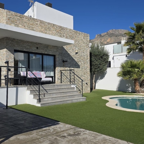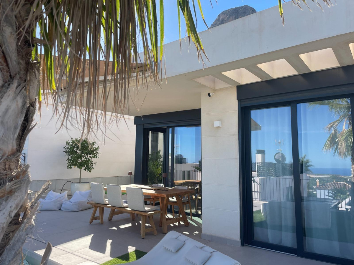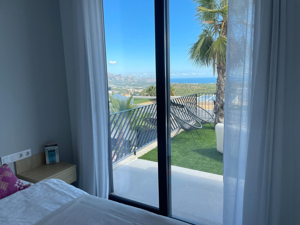 This is a unique opportunity to acquire a new construction villa ready to live in with panoramic views of the sea and the mountains. The property is located in an incomparable natural environment, at the foot of the imposing Mount Ponoig, with its 1181 meters high.From the terrace, the living room and the master bedroom of this villa, you will enjoy sea views that will leave you breathless. Here you can witness one of the most impressive sunrises in the area. The villa has a private pool, two bedrooms and two bathrooms, one of them en suite. The open living room connects directly to the kitchen and garden. The kitchen, equipped with an induction hob, combined microwave oven, extraction system and a separate kitchen island, is an example of modern and functional design. The hot water supply is controlled by a heat pump boiler, and the entire house is air conditioned. In addition, there are six solar panels on the roof. The villa has a private access road and was completed in 2022.The house is located in the Polop Hills urbanization, a gated community with surveillance cameras that offers single-family homes of modern design. In addition, the urbanization has a social house and a community pool.The villa is located about 50 minutes from Alicante airport and just 15 minutes from the beaches of Altea and Albir. Benidorm, with its long beaches, shops, restaurants and nightlife, is approximately 11 kilometers away. Likewise, there are numerous golf courses within a radius of a few kilometers. Polop has around 17 hiking routes, from the easiest ones suitable for all levels to some designed for professionals. In addition, climbing lovers have options just behind the urbanization. Polop is well connected to Alicante and Valencia through the AP-7 motorway.This villa is the epitome of luxury living on the Costa Blanca, with spectacular views and modern amenities. Contact us today to schedule a showing and take the first step towards your new home!