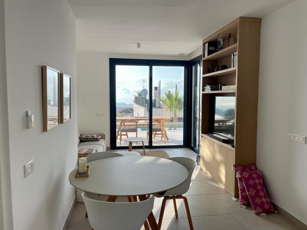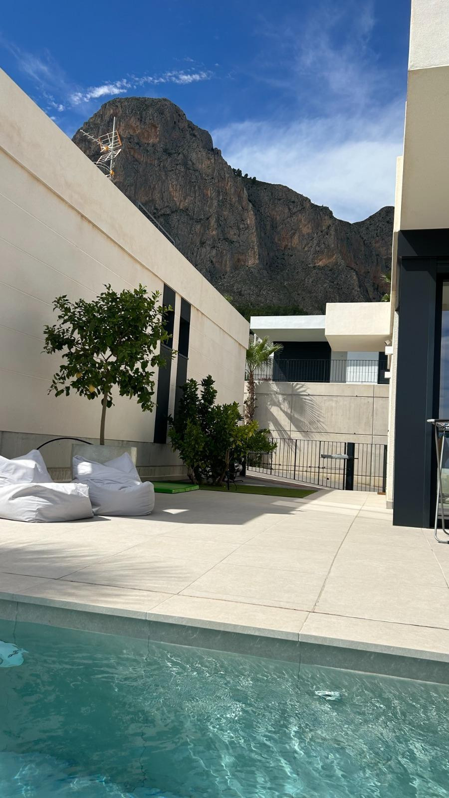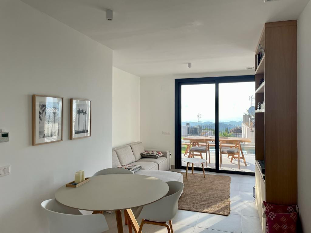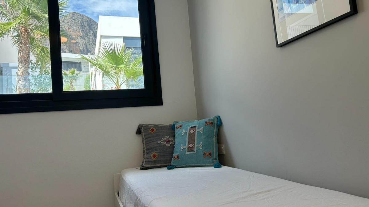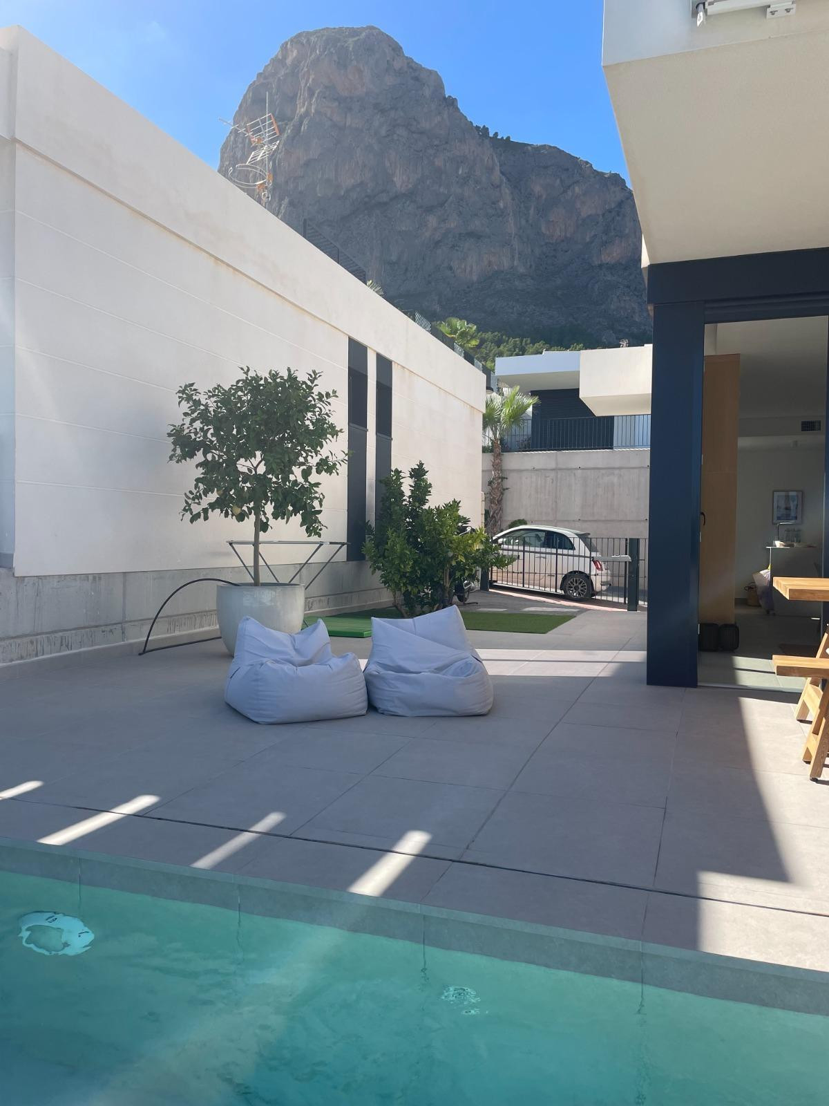 This is a unique opportunity to acquire a new construction villa ready to live in with panoramic views of the sea and the mountains. The property is located in an incomparable natural environment, at the foot of the imposing Mount Ponoig, with its 1181 meters high.From the terrace, the living room and the master bedroom of this villa, you will enjoy sea views that will leave you breathless. Here you can witness one of the most impressive sunrises in the area. The villa has a private pool, two bedrooms and two bathrooms, one of them en suite. The open living room connects directly to the kitchen and garden. The kitchen, equipped with an induction hob, combined microwave oven, extraction system and a separate kitchen island, is an example of modern and functional design. The hot water supply is controlled by a heat pump boiler, and the entire house is air conditioned. In addition, there are six solar panels on the roof. The villa has a private access road and was completed in 2022.The house is located in the Polop Hills urbanization, a gated community with surveillance cameras that offers single-family homes of modern design. In addition, the urbanization has a social house and a community pool.The villa is located about 50 minutes from Alicante airport and just 15 minutes from the beaches of Altea and Albir. Benidorm, with its long beaches, shops, restaurants and nightlife, is approximately 11 kilometers away. Likewise, there are numerous golf courses within a radius of a few kilometers. Polop has around 17 hiking routes, from the easiest ones suitable for all levels to some designed for professionals. In addition, climbing lovers have options just behind the urbanization. Polop is well connected to Alicante and Valencia through the AP-7 motorway.This villa is the epitome of luxury living on the Costa Blanca, with spectacular views and modern amenities. Contact us today to schedule a showing and take the first step towards your new home!