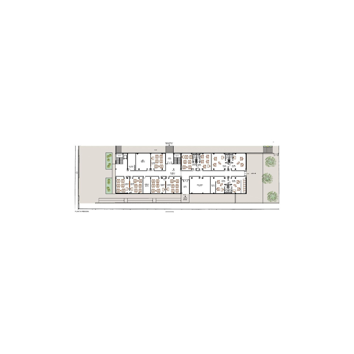 It is a newly constructed rectangular building, with two floors built out of the three that were planned, in which space has been left for stairs and a lift, in case the project is completed. The structure is made of steel and hollow core slabs and the interior, compartmentalised with plasterboard partitioning, is a very versatile space that can be easily transformed with a small amount of building work.