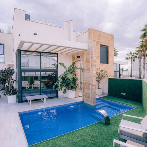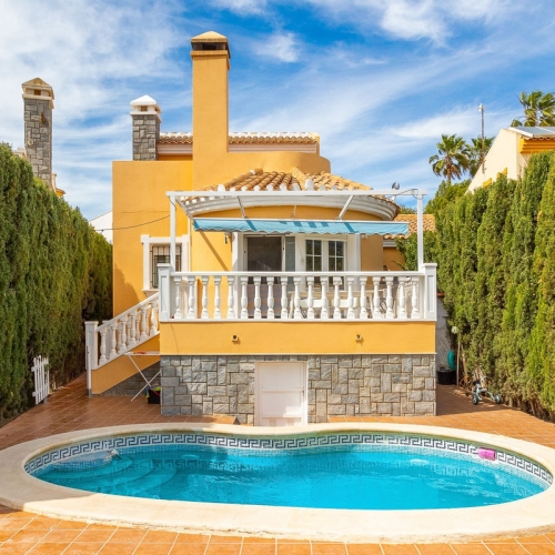 Cabo Roig, Detached villa on the corner of two streets with a 522 m2 plot and south-east orientation, and just 300 meters from Capitan beach, with a two-story house of 276 m2, the house has 5 bedrooms, 2 full bathrooms, 60m2 living room with fireplace, large independent kitchen, 8x3 pool with a barbecue area, large terrace in front of the house, sold furnished and with air conditioning and heating. Garage for 2 cars with pergola.