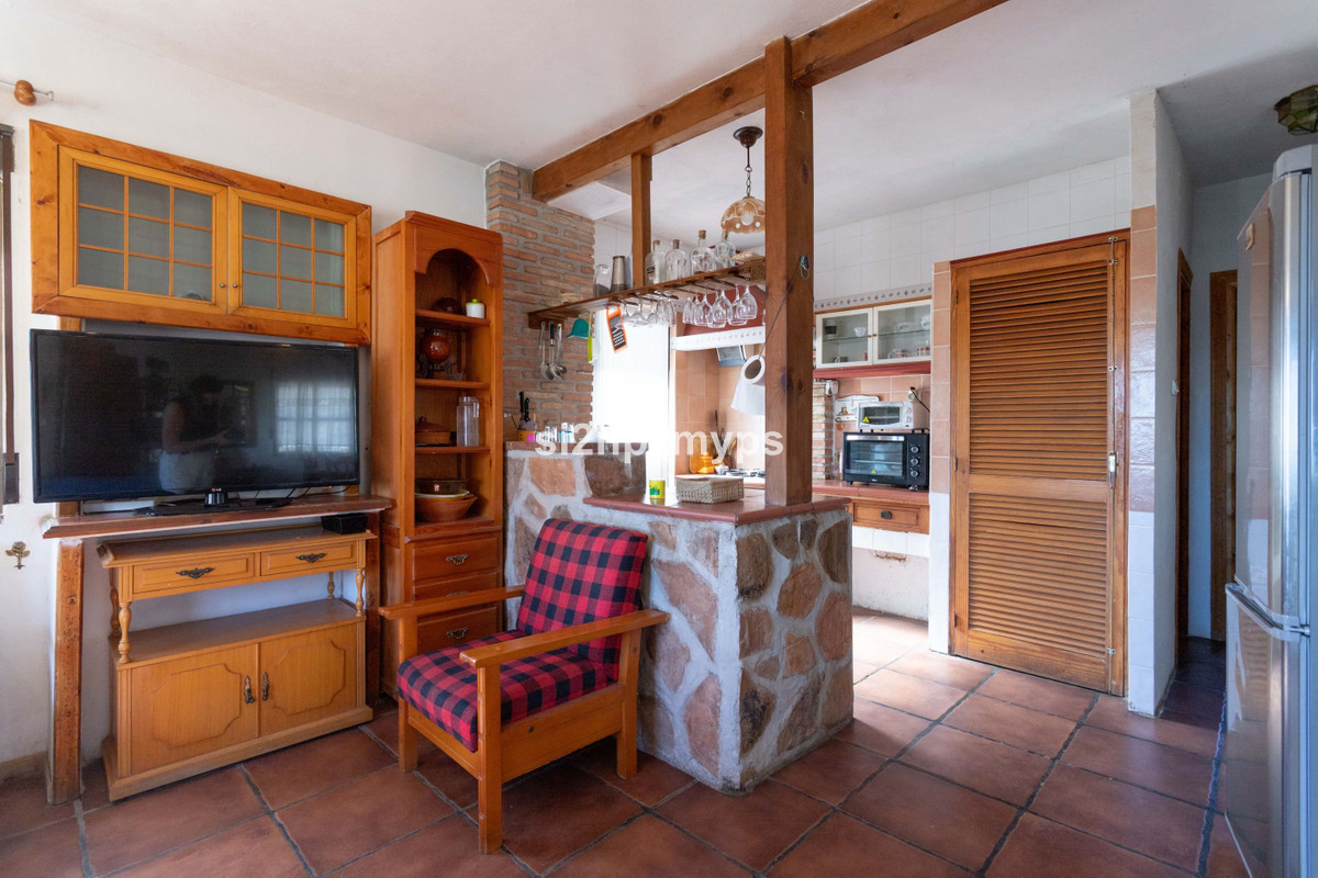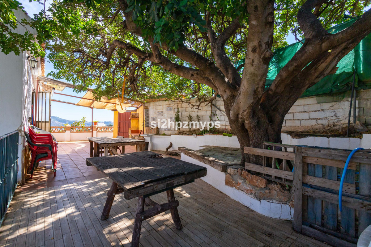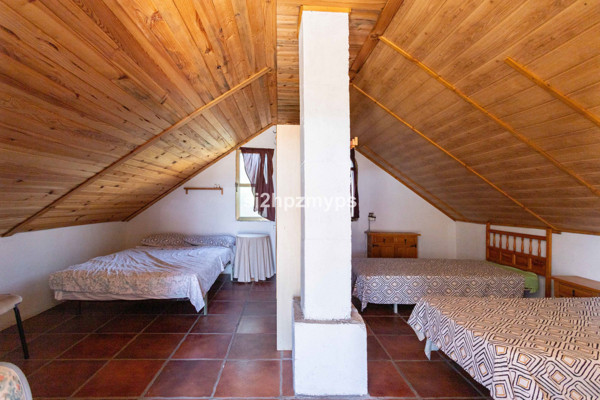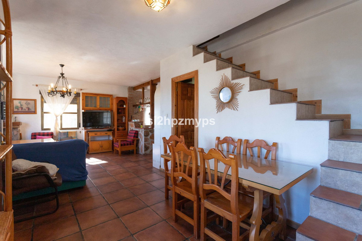 Upstairs there is a living room with fireplace and open plan kitchen, three bedrooms and a bathroom. From the kitchen there is an exit to a patio with the 200-year-old algarrobo tree.