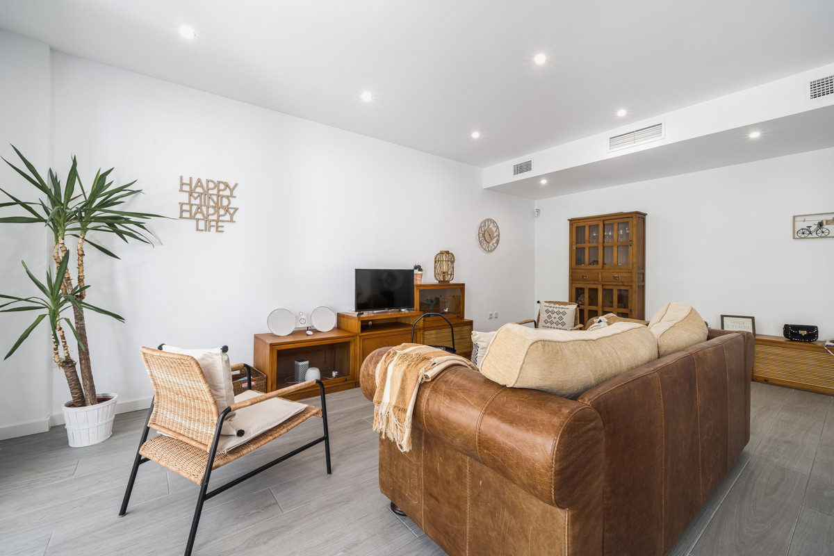 The apartment comprises a good-sized living/dining room with access to a large covered terrace with dining/seating area and giving access to the private garden of the property; open-plan fully fitted and equipped kitchen; 2 en-suite bedrooms; guest toilet. It comes with 2 parking spaces and a storage room situated in the underground communal garage.