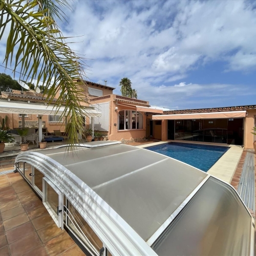 A large terrace offers sea views, a pool of 55 m2 and a well-equipped summer kitchen with barbecue and covered seating area, as well as a covered parking for two cars.