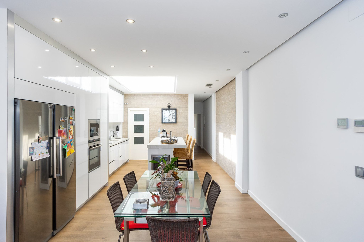 This modern villa here is about 509 square meters and has seven bedrooms, seven bathrooms, living room and kitchen. Added to this is a large terrace and a nice balcony, both with unbeatable views.