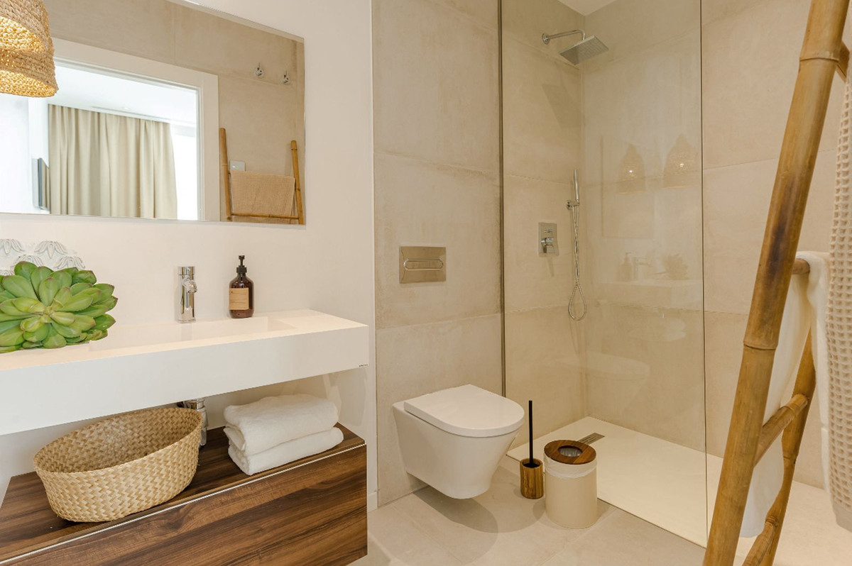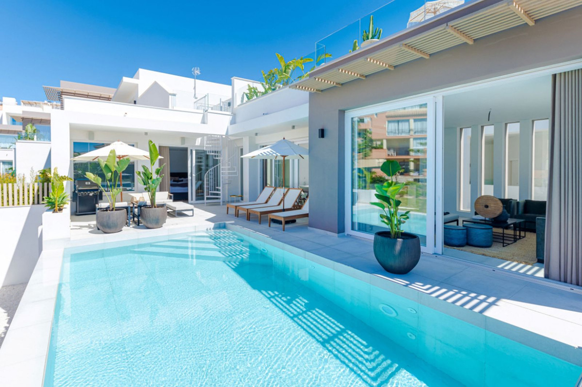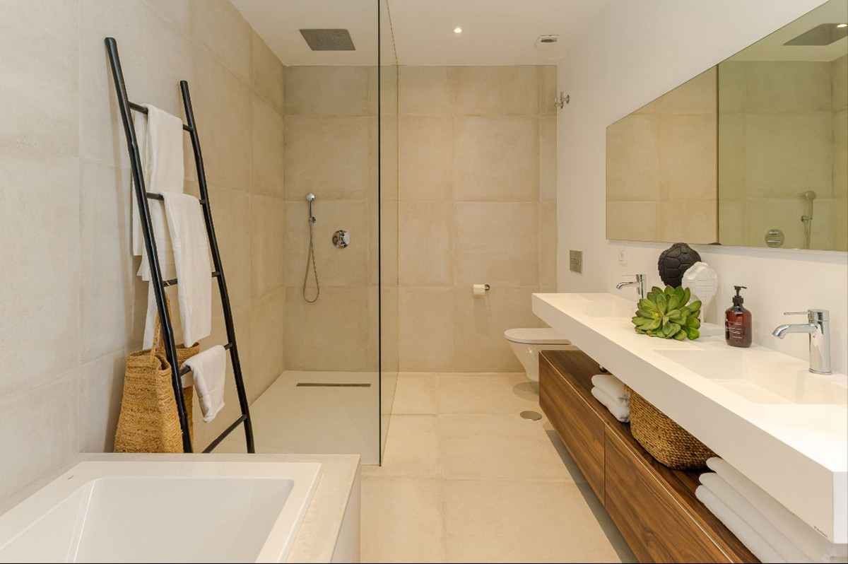 With a combined build size of 476 m2 these two properties consist of two lounges, two fully-equipped open-plan modern kitchens, two guest bathrooms and two large laundry rooms. All nine bedrooms (three in one property and six in the other) have ample fitted wardrobe space and ensuite bathrooms with underfloor heating. Nine of the bathrooms have walk-in showers, sink, and toilet and 1 bathroom has bathtub and shower. Most of the bedrooms have a semi-private outdoor space and are also equipped with a flat-screen TV.