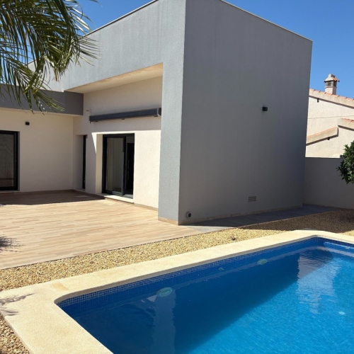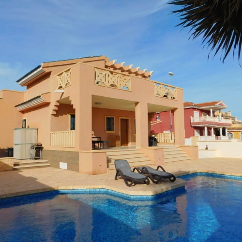 Here we have this is a Modern and spacious 4 (5) bed villa is located in a quiet area of Quesada with Stunning Salt lake views.  From the Private sun terrace you see across the Salt Lakes and out toward the Sea and Costa Blanca coast line, this property is located in a quiet area of Quesada, but only a short drive from all the amenities of Quesada and Dona Pepa. On entrance this is a 4 bed villa arranged across 2 floors, accessed from a large front terrace.  On the ground floor we have a modern and bright living space, here the large and modern kitchen, dining and living space offers plenty of room to arrange a layout of these areas as suits your needs.  Here also we have the Master bedroom with en suite and 2 double size bedrooms with fitted wardrobes, and a family bathroom, also some additional separate storage space, and outside separate from the kitchen a additional utility or laundry room.  On the 2nd floor there is a further 4th bedroom, and this has double access to the terraces/solarium of the property facing forwards towards the Salt lakes and at the rear across Quesada.  On this floor also there is an additional room, currently used as an office but equally could be a 5th bedroom or any space that you would prefer. This villa is well maintained and very well presented with excellent building quality,  integrated hot and cold air-conditioning, electric gates and security grills, alarm and a private, secure and fully wall plot.  This property can be sold part furnished. Outside the large covered terraces looks out over the bespoke designed and built swimming pool, and the rest of the property.  The villa is well situated on the 525 square meter plot, with spaces and areas around the villa at varying points throughout the day offering the sun and shade which provide quiet spaces to enjoy, to BBQ, or just relax.  T