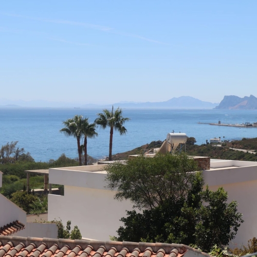 WONDERFUL CONTEMPORARY STYLE VILLA WITH GARDEN, PRIVATE POOL AND BEAUTIFUL VIEWS OF THE SEA, GIBRALTAR AND AFRICA. With a privileged location in a luxurious residential area in Torreguadiaro, JUST 5 MIN WALK FROM THE BEACH and the promenade, which will take you to the famous Port of Sotogrande, where you will find a large selection of bars, restaurants and leisure areas. Prestigious polo fields such as Ayala or golf courses such as Valderrama are 4 km away, Gibraltar airport is 10 km away and Marbella is 30 km away. This beautiful property is distributed over three floors, built with top quality materials and excellent finishes. Enjoy great light thanks to its large windows throughout the house and its SOUTH ORIENTATION. On the first floor we find the spacious living-dining room with an integrated kitchen, all in an open-plan style, very comfortable and uncluttered. On the upper floor, the rooms, of which the magnificent master bedroom with an ivory-tone marble jacuzzi bathroom. All rooms are equipped with custom wardrobes made of white lacquered wood, a minimalist and orderly feeling that achieves the entire design of the Villa.