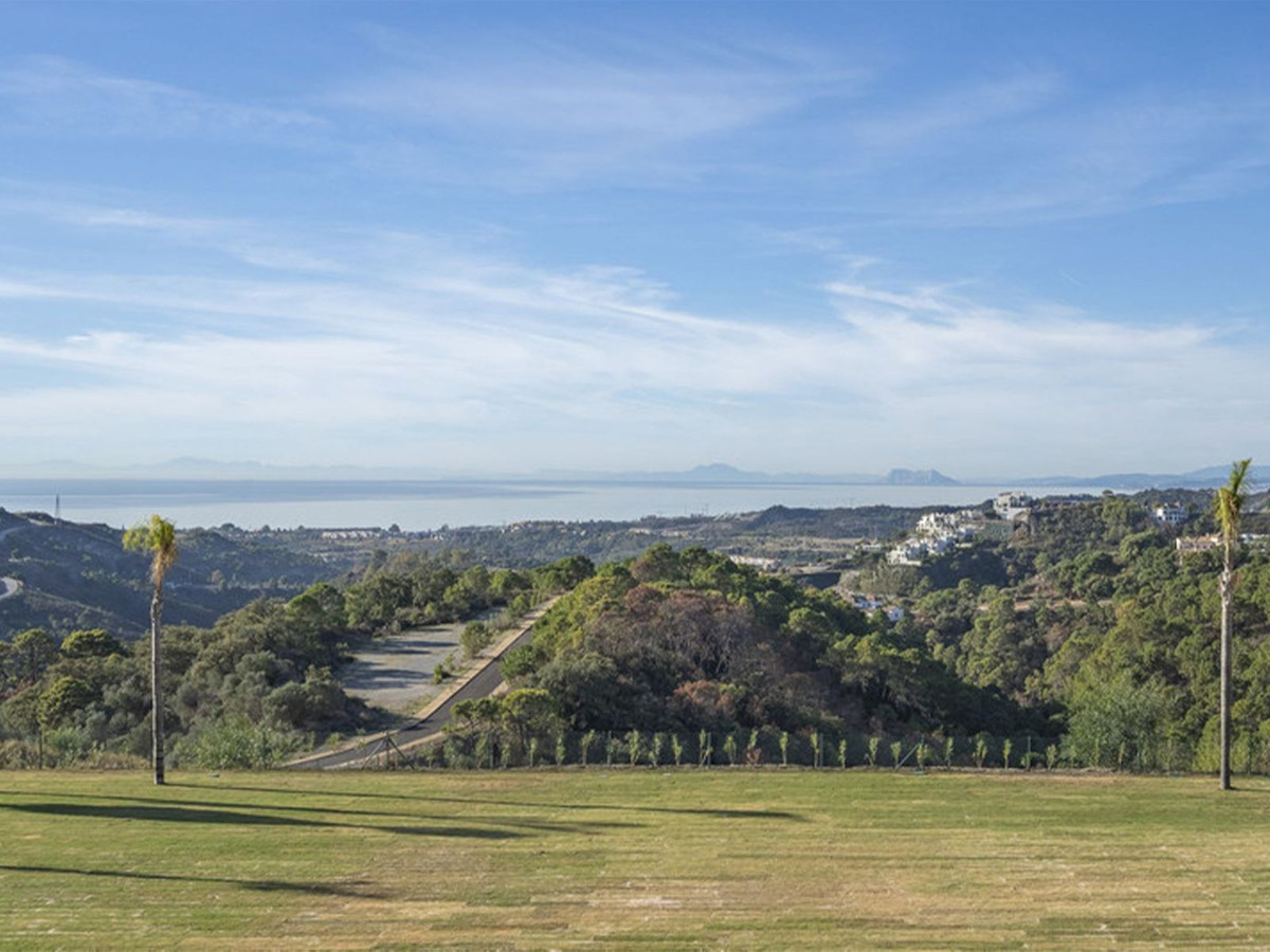 The entrance level welcomes you with a spacious living room adorned with a stunning fireplace, complemented by book-matched marble. The open-plan layout seamlessly connects to the Gaggenau-equipped kitchen. Both areas have access to the terrace through pocket Schuco doors, providing panoramic views of the Mediterranean Sea, Gibraltar, and the Moroccan coastline on clear days. Additionally, this level features a small swimming pool separate from the main pool and garden.