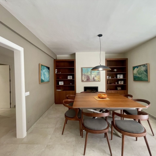 The ground floor consists of a double-height ceiling in the entrance/staircase hall which leads you to a distributor that gives access to a laundry/pantry room, guest toilet, wheelchair-friendly elevator, and a study room/bedroom from where you can see the pond/water feature.