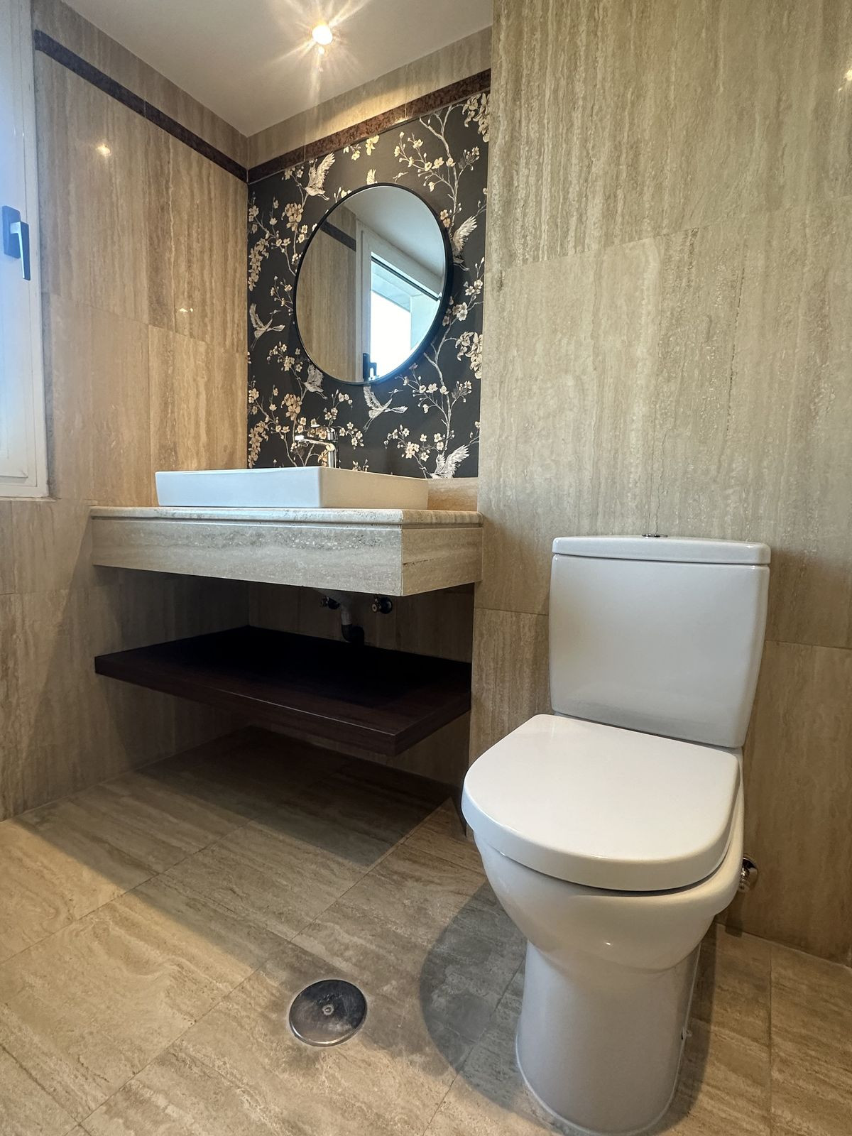 A modern staircase takes us to the second floor, where there is another bedroom, a full bathroom, a wardrobe area, and a large master bedroom with a dressing area and a full bathroom, all with access to the large terrace with views.