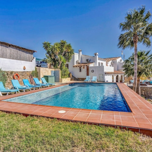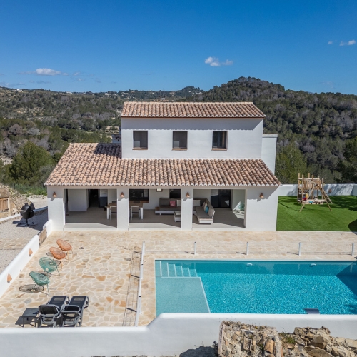 Exceptional Villa with private pool located in Calpe, with spectacular views of the sea and the mountains, and a lot of privacy. Located in the Oltà area, a less crowded urbanization, very quiet and sunny, as well as cool, since it is located 200 m above sea level. Surrounded by forests and hiking trails. This villa, unlike conventional villas, was built in 2010 with ecological materials and designed with bioclimatic criteria, which allows the home to maintain a comfortable temperature and humidity throughout the year, with hardly any use of heating or air conditioning. However, for greater comfort, hot-cold pumps have recently been installed through ducts on the ground floor and with splits on the upper floor. It is built following the patterns of typical Mediterranean farmhouses. This villa is built on a plot with an area of 10,030 m², with a completely flat surface and fenced throughout its perimeter of 1,350 m2 and the rest of the plot forming terraces with the possibility to plant fruit trees or enable that area for horses, etc. The house has a constructed area of 230 m² with 80 m2 of basement. Its interior is decorated in a modern style contrasting with the rustic style of the exterior of the house. You can enjoy its spacious living-dining room and its covered and glazed terrace. Villa Natura has internet connection through WIFI. Ground Floor: (Access via a step). Large living room-dining room, furnished with modern and comfortable furniture. From the living-dining room you have direct access to the covered and glazed terrace and the pool and barbecue area. On this floor is the American kitchen, very functional and with an exclusive design, equipped with appliances; Next to the kitchen are the laundry and pantry. This floor has 2 double bedrooms and 1 bathroom with shower, toilet and sink. First Floor: (Access by internal stairs): On this floor is the master bedroom, with wonderful views of the sea and the Peñón de Ifach, a en-suite bathroom with large shower, WC and sink and a large dressing room that could also be used as a bedroom. This same floor has another double bedroom and an en-suite bathroom with bathtub, WC and sink. Exterior: The house is surrounded by a large plot with an area of 1350 m², completely flat and fenced around its perimeter, it has a different garden spaces, both with native plants and fruit trees. It also has a covered and glazed terrace, with views of the sea and the pool. The pool has dimensions 8x4, with Roman stairs and is shallow (0'90-1'65), where you will enjoy a pleasant swim while contemplating the views of the sea and the mountains. Note that the pool chlorination system is also ecological. Around the pool, you can enjoy a large and comfortable area of artificial grass, ideal for sunbathing, and which has an outdoor shower. Large parking area on the same plot for 3-4 vehicles. Distances: Located 4 km from Calpe, 5 km from the "Arenal-Bol" beach and main promenade, 4 km from several supermarkets and 3 km from An urban bus stop and the Denia-Alicante regional train.