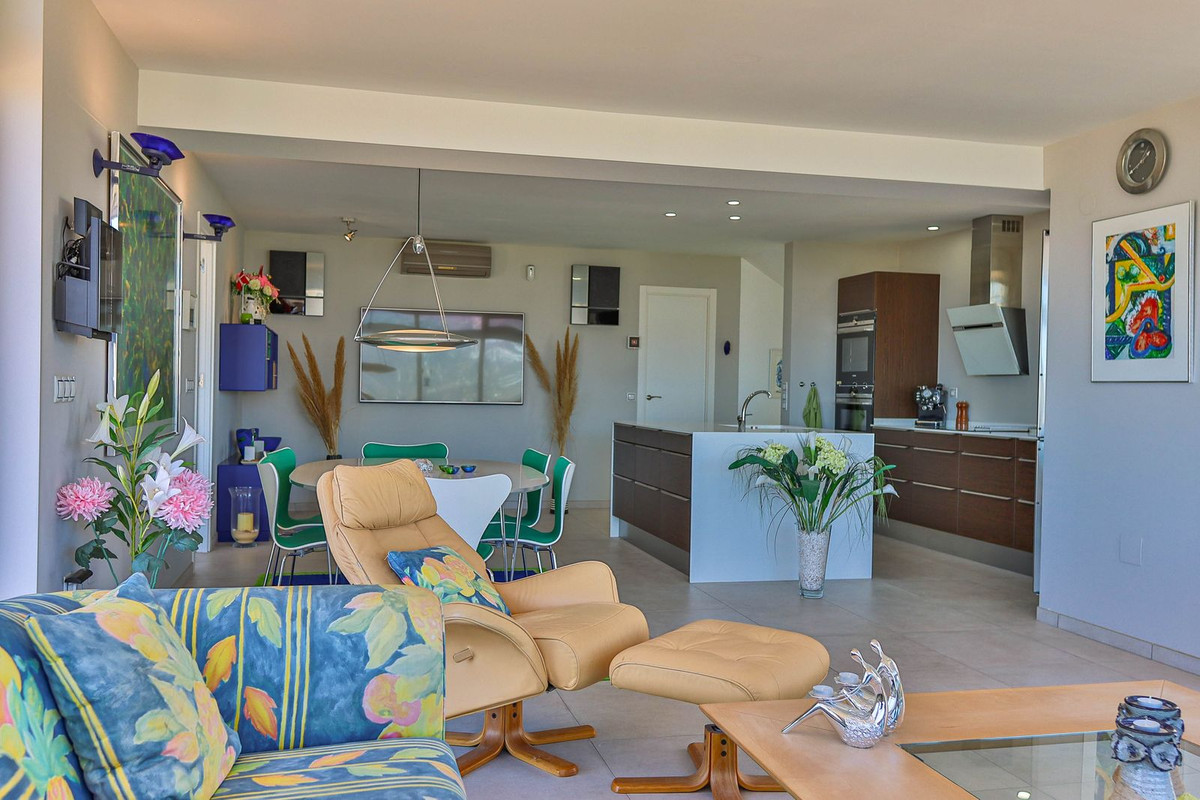A staircase ascends to a terrace above the living room, which includes a bright covered terrace and a large open terrace offering panoramic views.