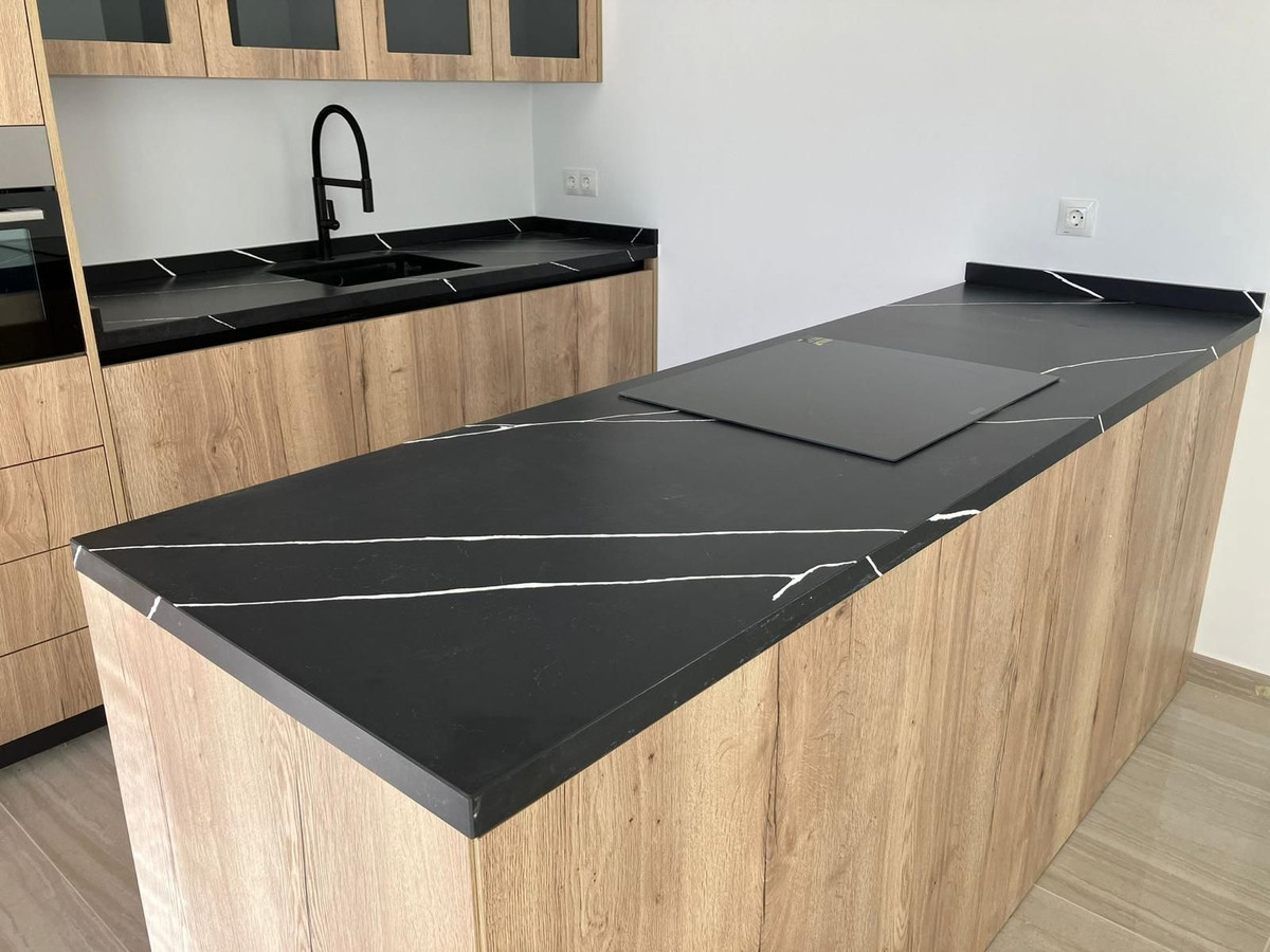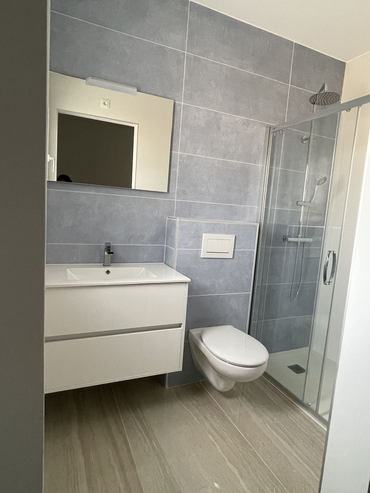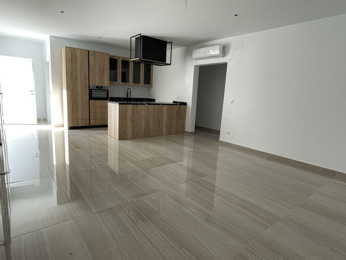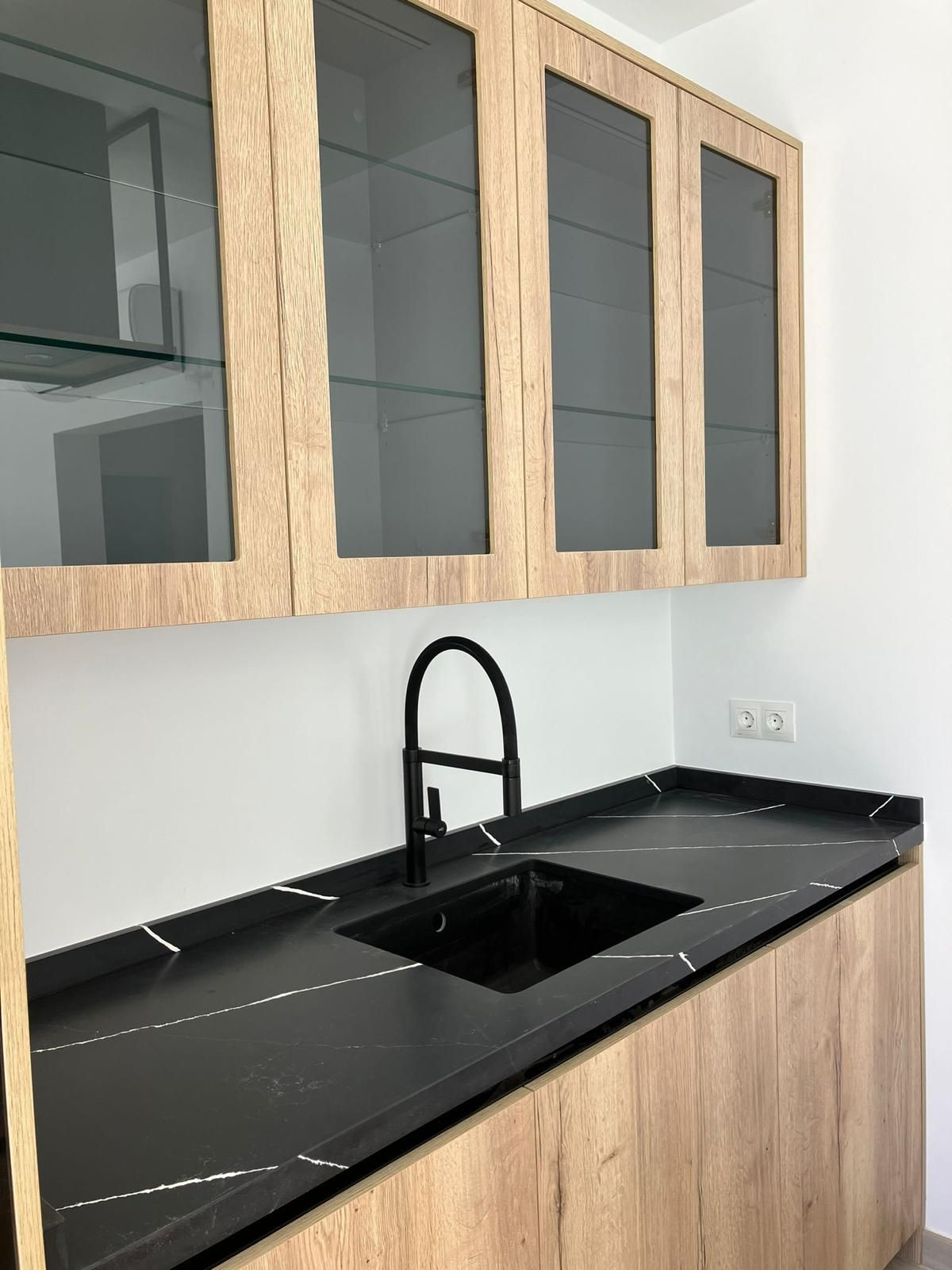 The kitchen is equipped with oven, induction stove, cooker hood, dishwasher and refrigerator. The open living area offers access to the guest toilet.