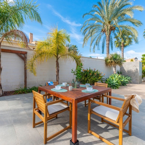 Located in a very quiet area in Salinas on a spacious plot of 10,249 sqm, this beautiful low-rise 3-bedroom villa offers a true oasis of tranquility. With a southern orientation, the garden is bathed in natural sunlight, allowing you to fully enjoy the outdoor space.