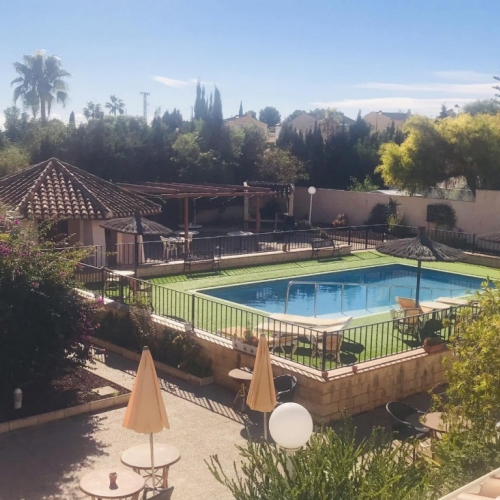 Pool and sunbathing area and attractive Mediterranean gardens.