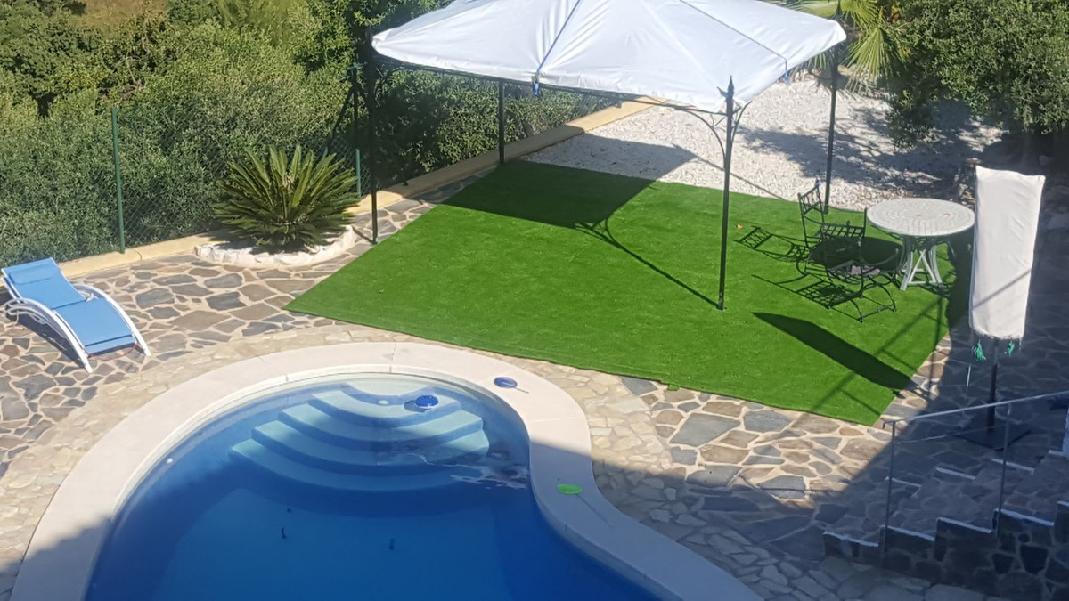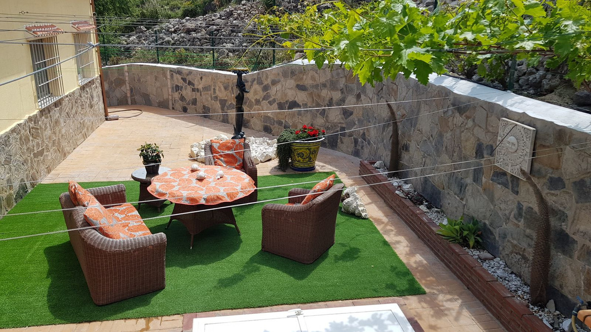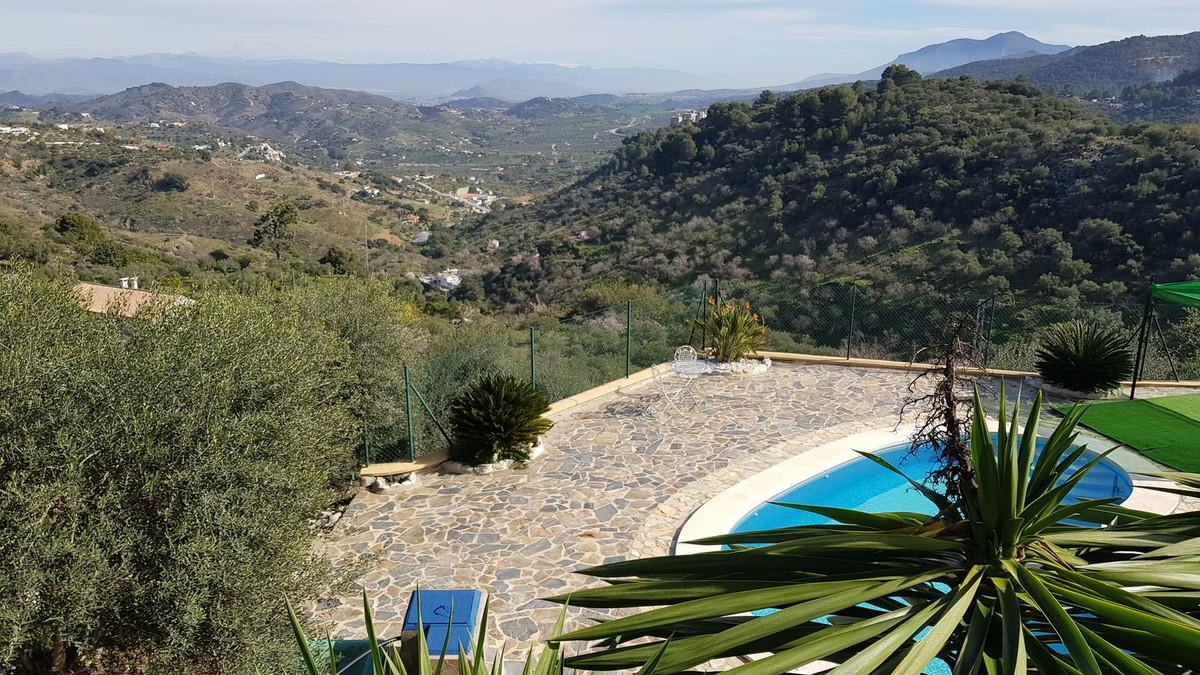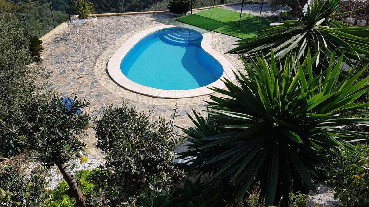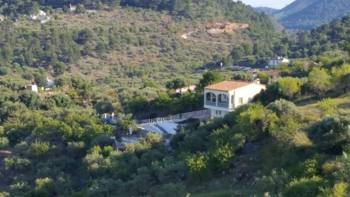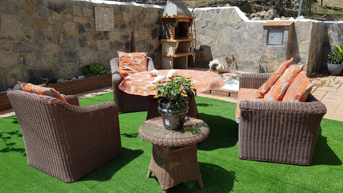 This beautiful country house - built in 2012 - has a large garage with workshop (approx. 45 m²), a guest flat (approx. 45 m²) with living room and open-plan kitchen, a shower room and a separate large terrace. The living space is approx. 90 m². There are 2 bedrooms and 2 bathrooms (one en-suite) and an open-plan kitchen - very smart and only 3 years old. A large terrace of approx. 30 m² with marvellous views of the mountains as far as Málaga and the Sierra Nevada is accessible from the living room, another terrace is located behind the building. There is a private well and a large underground tank with a capacity of 11,000 litres for drinking water in case the groundwater is insufficient. A small pool - not heated, no air conditioning and no heating - just a fireplace in the living room. The plot measures approx. 3,500 square metres and is planted with olive trees, lemon trees, vines, almond trees, etc.