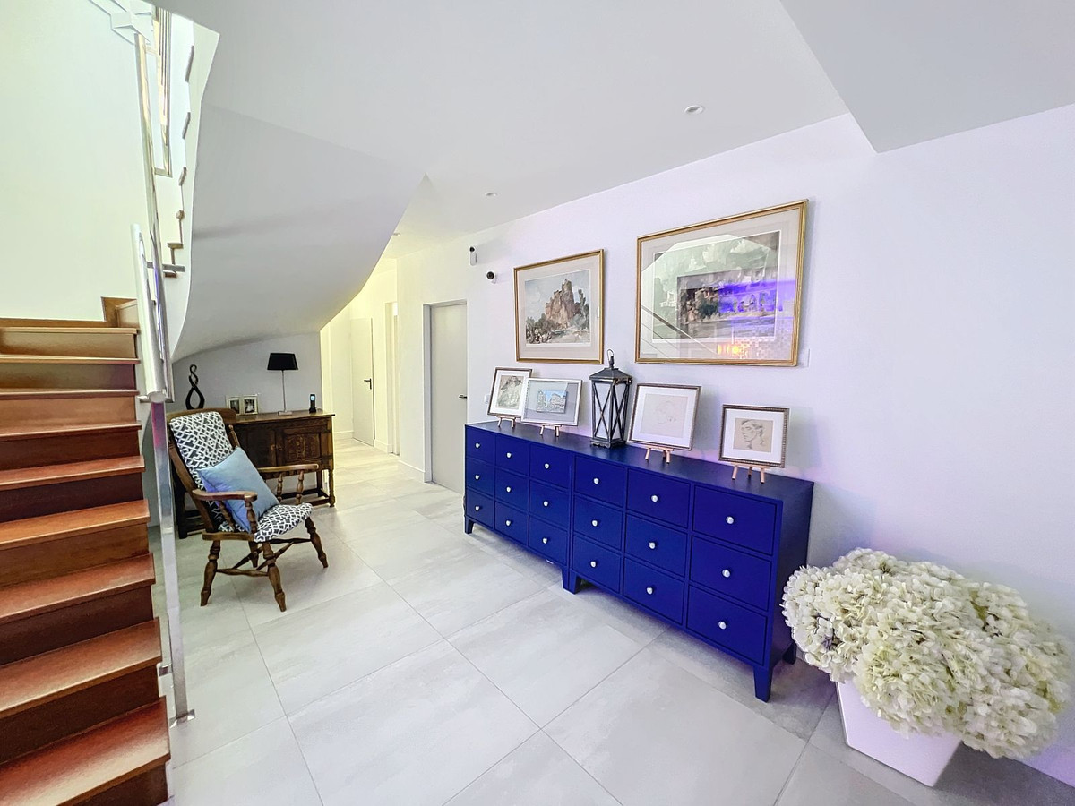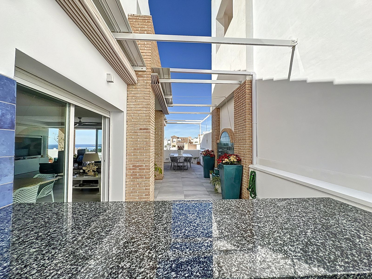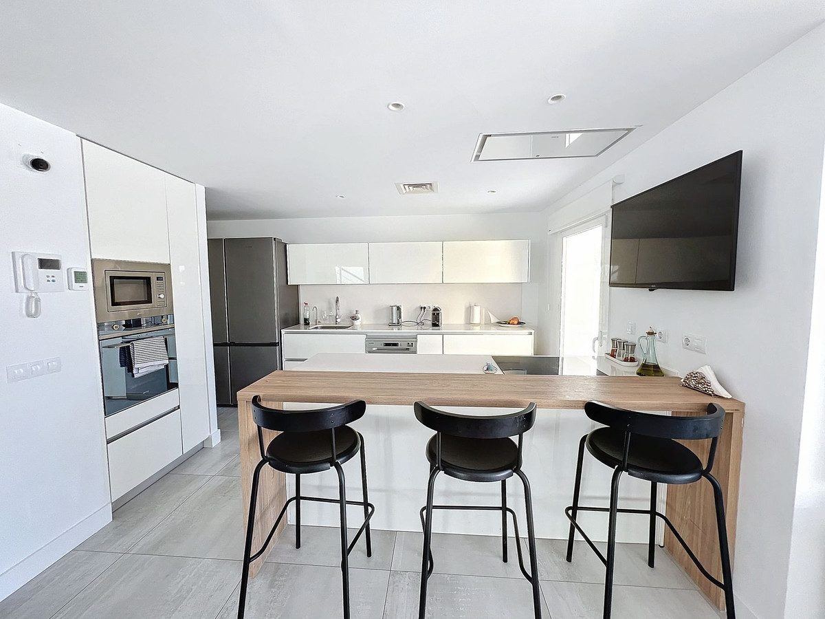 Nestled in the prestigious Big Blue Villas community in Benalmádena, this beautifully renovated villa defines modern coastal living. Spanning three levels, the home offers 3 spacious bedrooms, 3 sleek bathrooms, plus an additional guest toilet – ensuring abundant space and privacy for all. On the ground floor, you'll be greeted by a stylish open-plan living area, featuring a stunning LED-lit bar that sets the perfect ambiance for entertaining, alongside a projector TV for an immersive movie experience. Double doors open out to the terrace, extending your living space and seamlessly blending indoor and outdoor living. The master bedroom, located on this level, is a true retreat, offering a luxurious en-suite bathroom and a large walk-in dressing room. A guest bedroom with its own en-suite ensures comfort and privacy for visitors. On the first floor, you'll find a chic lounge area that flows effortlessly into a modern, fully-equipped open-plan kitchen and dining space. A utility room adds to the convenience. The expansive terrace offers panoramic sea views, creating the ultimate backdrop for relaxation or hosting guests, complete with a built-in bar for alfresco entertaining. The top floor is home to another en-suite guest bedroom, featuring its own private terrace – the perfect spot for unwinding with breathtaking views.
