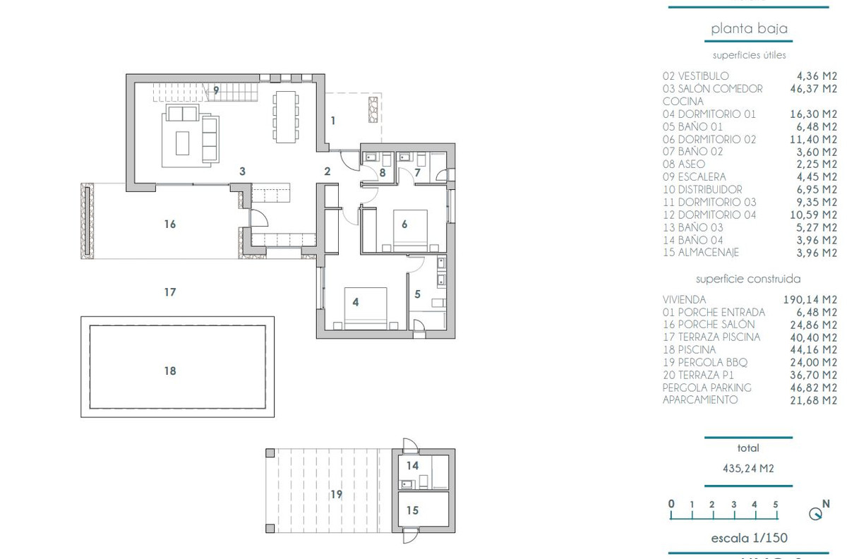 This contemporary villa gets 2 floors. On the ground floor is the spacious living-dining room, a modern kitchen, guest toilet and 2 bedrooms en-suite. Internal stairs lead to the upper floor where there are 2 more bedrooms with access to a private terrace. These bedrooms share a bathroom. From the lounge and kitchen, there is access to a covered terrace that flows seamlessly into the sun terrace around the 40m2 pool. Here there is also a pergola bbq where you are sure to spend many summer evenings at the dining table. Next to this pergola is a storage room and the fourth bathroom.