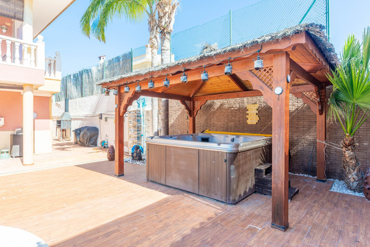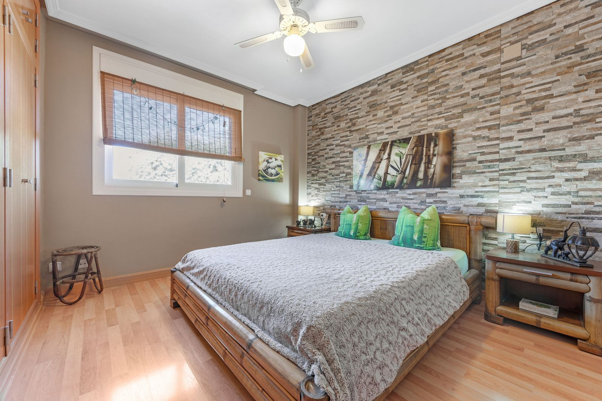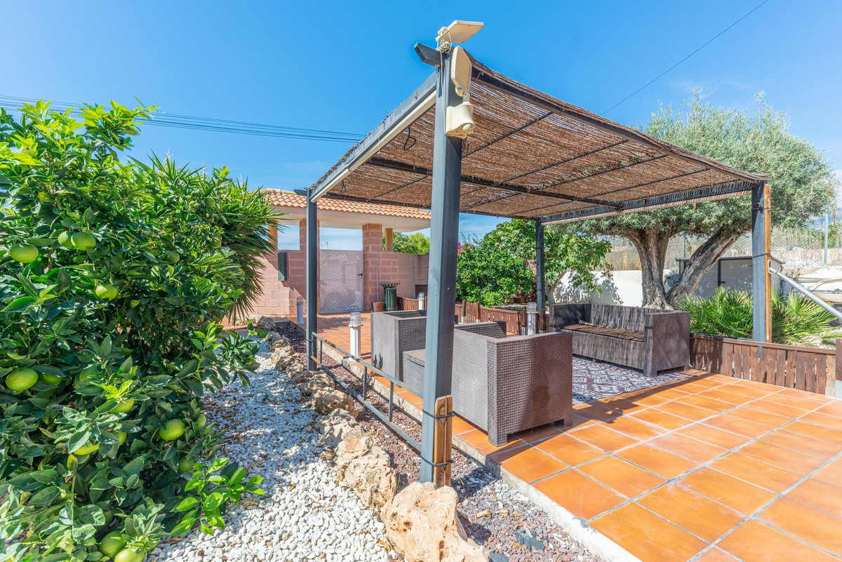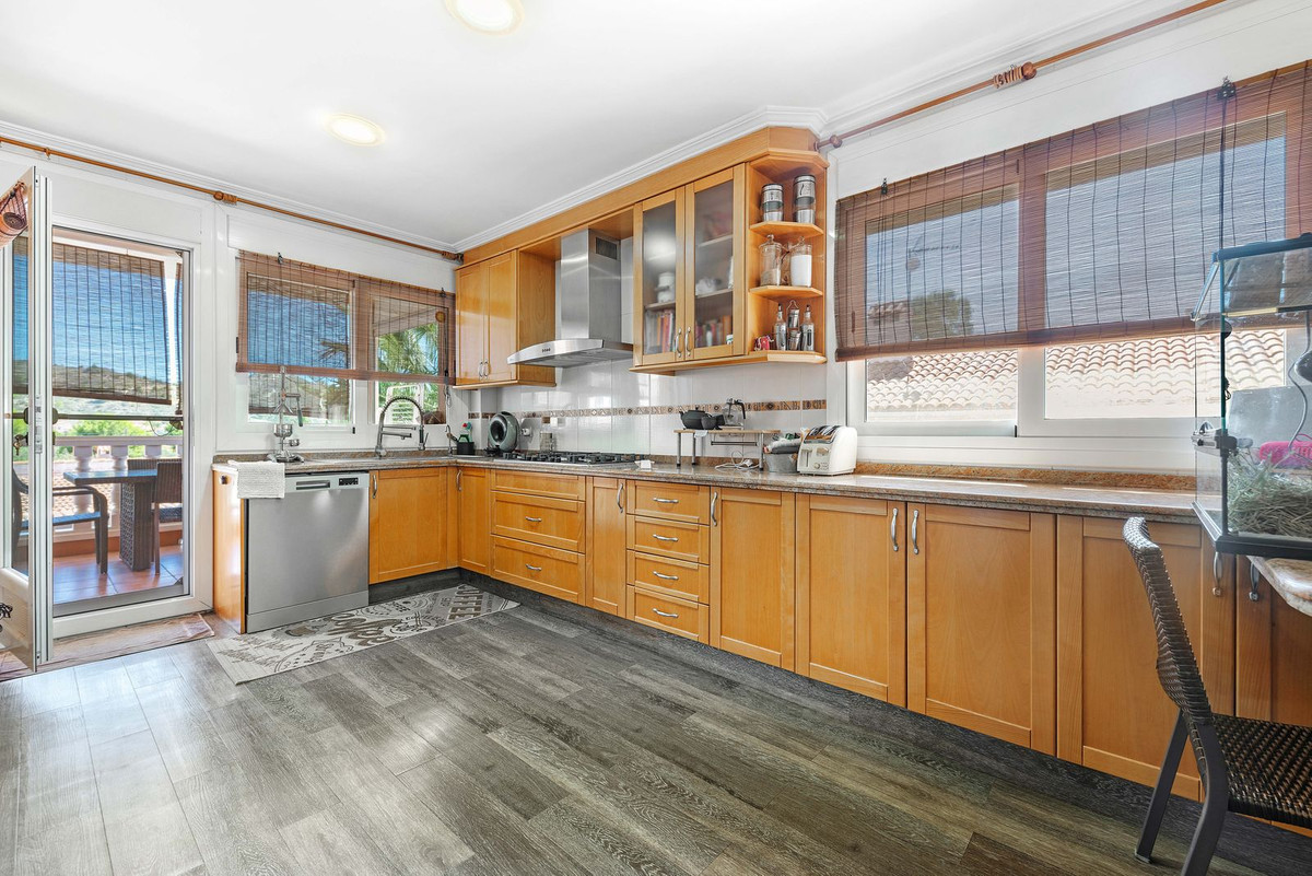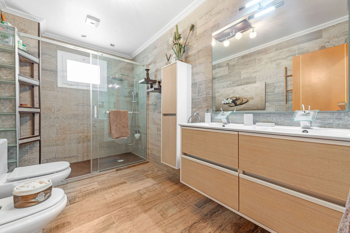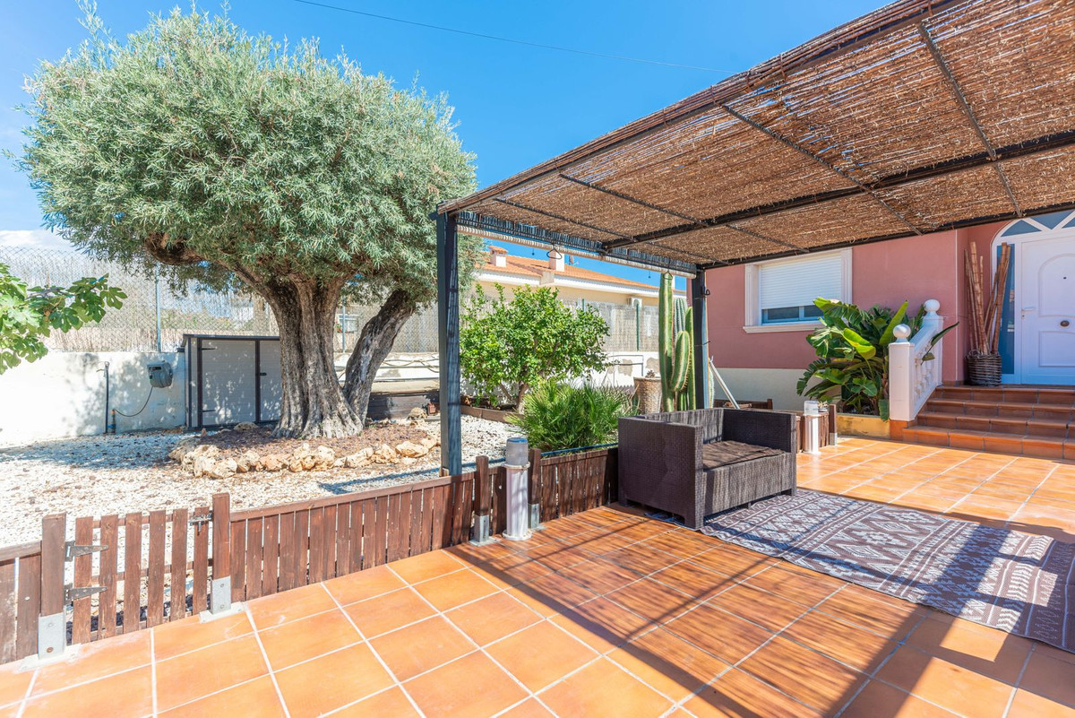 The rear of the villa is accessed via the road to Busot, where an automated gate provides access to a driveway and a garage for two cars. The upper floor is the main living area, with a spacious living-dining room featuring a wood-burning stove and electric heating inside the walls for the winter, and air conditioning for the summer. A good-sized, semi-equipped independent kitchen extends from the living room and includes a pantry and an adjacent laundry room. Both the living room and the kitchen have direct access to a large south-facing covered terrace, with views of the pool and the mountainous countryside in the distance. This floor also includes the entrance hall, two double bedrooms (one with a built-in wardrobe and the larger one with a walk-in closet and en-suite bathroom), and a separate family bathroom.