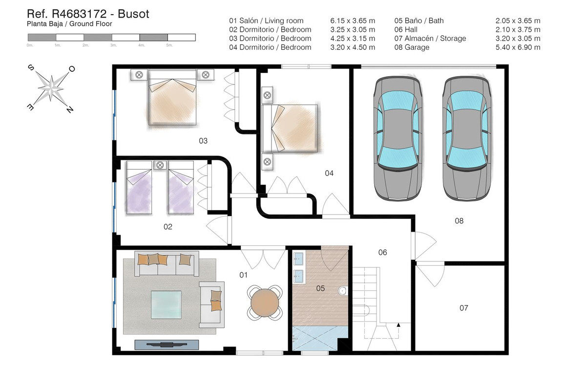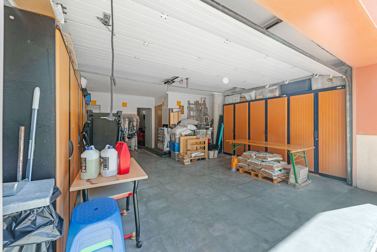 On the lower floor, you'll find three additional double bedrooms, along with a family bathroom with a shower. This floor also includes a living room, dining room, storage room, and an enclosed garage for two vehicles. From here, there is direct access to the pool terrace.