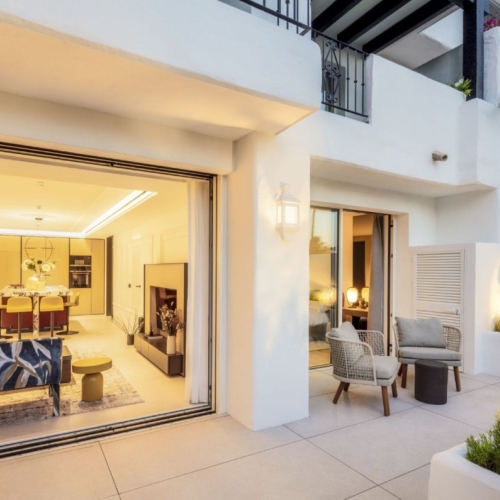 2 bed ground floor apartment in the exclusive, gated community of Lomas del Rey, exceptional high-quality construction melded with extraordinary attention to detail yield this contemporary apartment. Its expansive spaces, open concept floorplan and walls of glass create a breathtaking experience of spaciousness and light. On entering the home through the hallway, to the right, there is a large living/dining room and kitchen which open onto the expansive terrace. Straight ahead there is a corridor with guest toilet and guest suite with a walk-in closet. To the left is the sizeable master suite, also with walk-in closet and a private terrace.