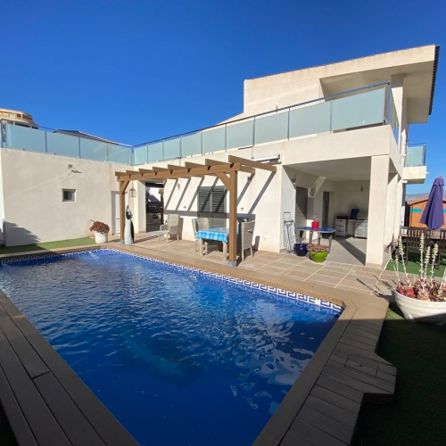 Here we have a beautiful detached villa in the countryside just outside of Cox, on the Costa Blanca South. This spacious Villa with a plot of 454 m2 and build 167 m2, South facing and built in 2009 one owner from new and consists of the following: On the ground floor there is a large living area, separate WC, double bedroom with access to the garden and  en-suite shower room, open plan dining area and fully fitted kitchen area with separate utility room off of the kitchen with access to the garden. Upstairs are two good size double bedrooms both with their own colour co-ordinated en suites, free standing bath in the master en-suite access to balconies and large solarium with amazing mountain views,