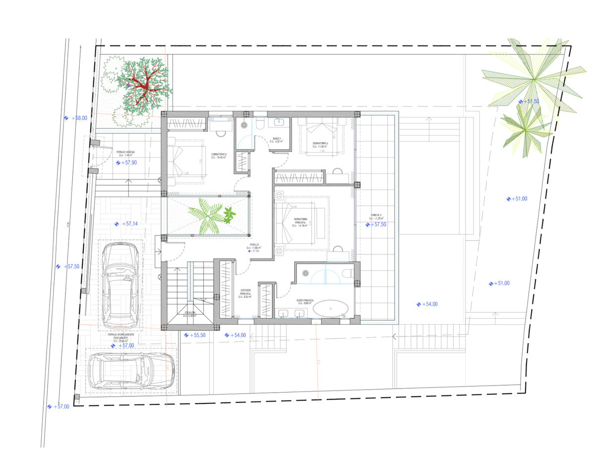 The first floor offers two bedrooms sharing a bathroom, plus the master bedroom with ensuite and walk-in wardrobe. Both the master and one bedroom open onto a covered terrace. This level also has an extra entrance and a parking space.