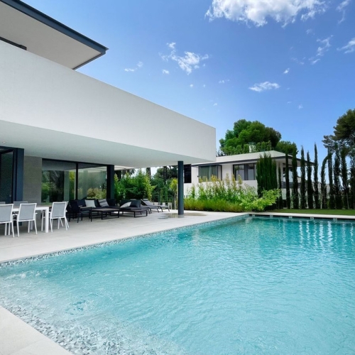 Set on a meticulously landscaped private plot, the villa features a heated swimming pool surrounded by lush greenery, creating an idyllic outdoor retreat. The ground floor offers an open-plan living and dining area that seamlessly connects to the garden, a state-of-the-art kitchen with premium appliances, and a stylish guest suite.