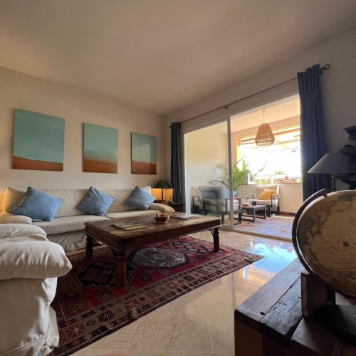From the main living room, you access the first terrace overlooking the beautiful gardens of the development, the golf course, and La Concha, an ideal place to relax outdoors or enjoy meals.