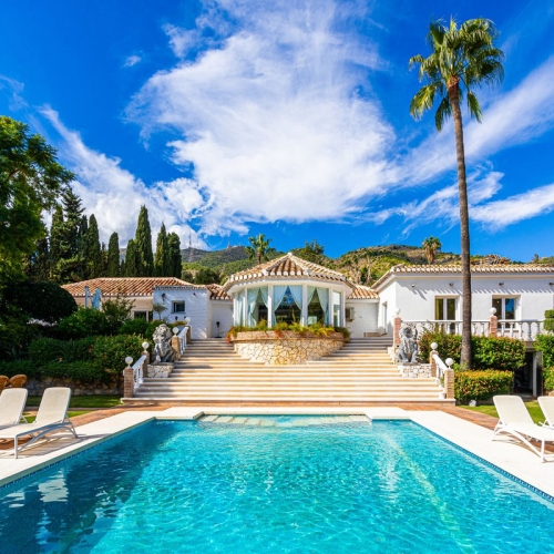 Main floor: Entrance hall with guest toilet and cloakroom, living room with fireplace and double height ceiling with access to large covered terrace with open sea views, elegant dining room with fireplace and access to the terrace and next to the fully fitted kitchen with dining area with access to the terrace. At this end of the Villa, we also find an office with sea views, large laundry room and pantry.