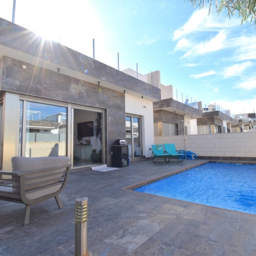 The property itself comprises a modern living and dining room with adjacent fully equipped open-plan kitchen and a separate toilet. On the first floor there are 2 more lovely bedrooms with terrace and a bathroom. There is also a solarium where you can relax with a drink in the Spanish sun.