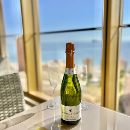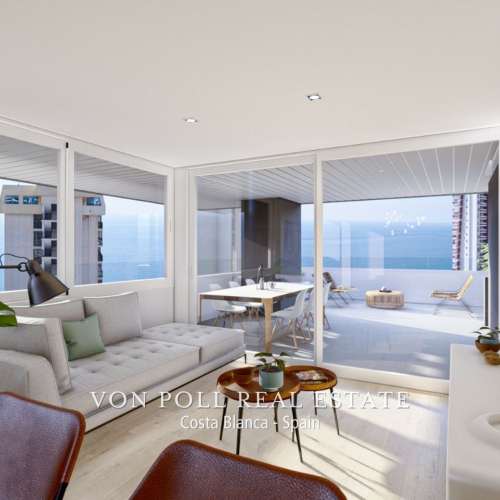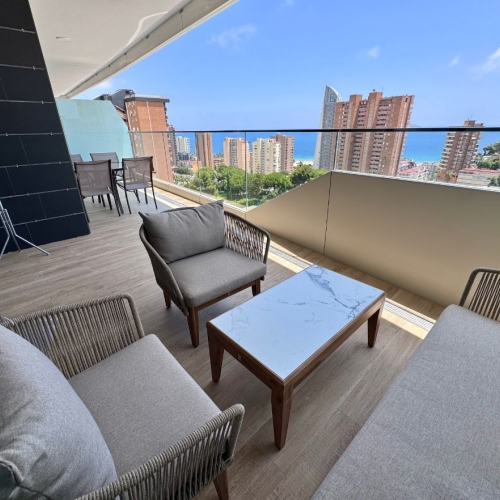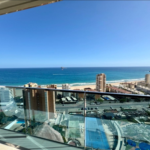 Exquisite accommodation with panoramic sea views in the famous Intempo complex located in Benidorm, Alicante province, on the Costa Blanca. This luxury apartment is a superb offer in one of the best residential complexes in the whole region, just a step away from Poniente beach in Benidorm.The apartment already holds a tourist license and has been 85% occupied for 2022 and 2023.Intempo is the tallest residential building in Spain and the second tallest in the European Union. It offers a wide range of amenities such as restaurants, cafes, fitness area, Sky Wellness, play area and much more. It is an ideal choice for those considering buying real estate in Intempo.The newest luxury apartments are located on the top floors of the INTEMPO tower on Poniente Beach in Benidorm. It comprises a spacious living room, separate kitchen and laundry room, two bedrooms, one of which is en-suite; and a 23m2 terrace with magnificent views of the sea and cityscape. The design, amenities and finishes of these apartments represent the pinnacle of quality on the market. All apartments have large balconies with access from the bedrooms and living room, providing complete privacy.EQUIPMENT:Every detail of these apartments, from the smallest to the largest, has been carefully considered to provide residents with a sense of luxury and comfort.The apartments are fitted with double glazing and low solar heat transmittance windows, ensuring comfortable temperatures all year round. Built-in closets with white lacquered doors and shelves. Each apartment has an individual air conditioning system with energy efficient heat pump. The kitchen is equipped with high quality white furniture, impact resistant worktops, stainless steel, electric oven, microwave, dishwasher, stove hood and glass ceramic hob, and refrigerator. The walls are painted white, the whole house is equipped with modern electrical equipment and the floors are covered with porcelain tiles.The apartment is located on a corner plot, providing a privileged view of the whole city. Owners can also enjoy the club area with common facilities such as a gym with a view, spa, massage rooms and a bar with freeshes.