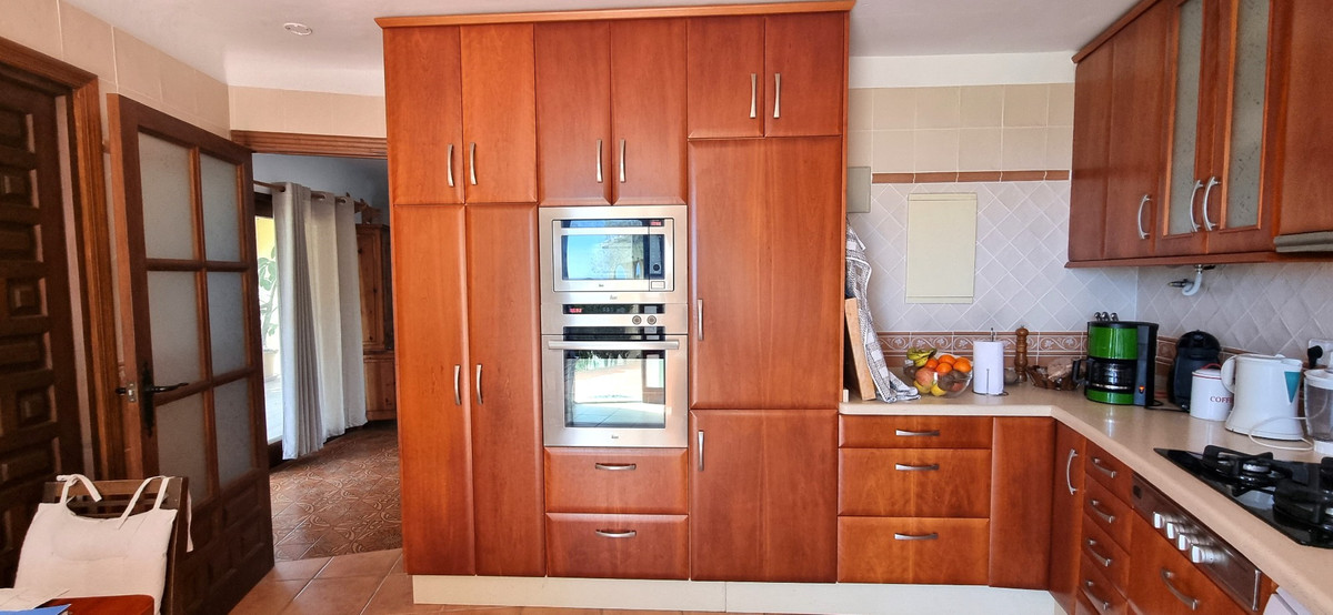 On the first floor you enter the kitchen, which is fully equipped. Here is the access to a separate guest toilet. Furthermore, you enter a spacious living-dining room with fireplace, from where you go to a spacious covered terrace with views of the sea, mountains and village. Here there is also a separate closed spacious office, which has magnificent views of the golf course.