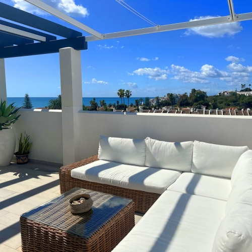 Surrounded by nature and high-end properties, this south-facing triplex penthouse spans 275 m² and is designed to impress. Built to the highest specifications, it combines modern aesthetics with utmost comfort and functionality. The main level, initially designed as a 3-bedroom apartment, now features an open-plan concept uniting a stylish living room, dining area, and sleek kitchen with an island and bar, creating a spacious area perfect for entertaining. Wide sliding windows and glass doors ensure a seamless connection between indoor and outdoor spaces, flooding the interior with natural light. The fabulous 107-m² terrace allows residents to fully enjoy the fantastic sea and mountain views and the exceptional Costa del Sol climate.
