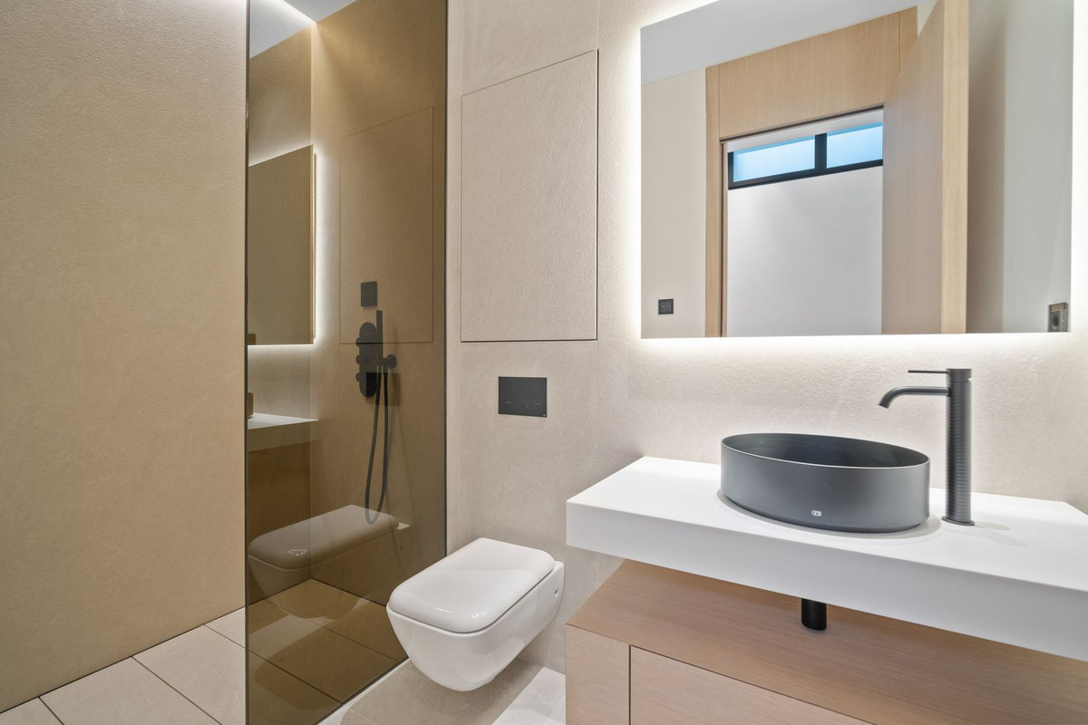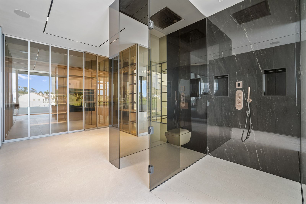 The first floor presents a sensational Master bedroom suite, featuring double-height ceilings, glass-fronted walk-in wardrobes, and a luxurious bathroom complete with an oversized shower and a standalone bathtub that overlooks the terrace and the Mediterranean beyond. Two additional exquisitely designed bedroom suites grace the first floor, boasting opulent bathrooms.