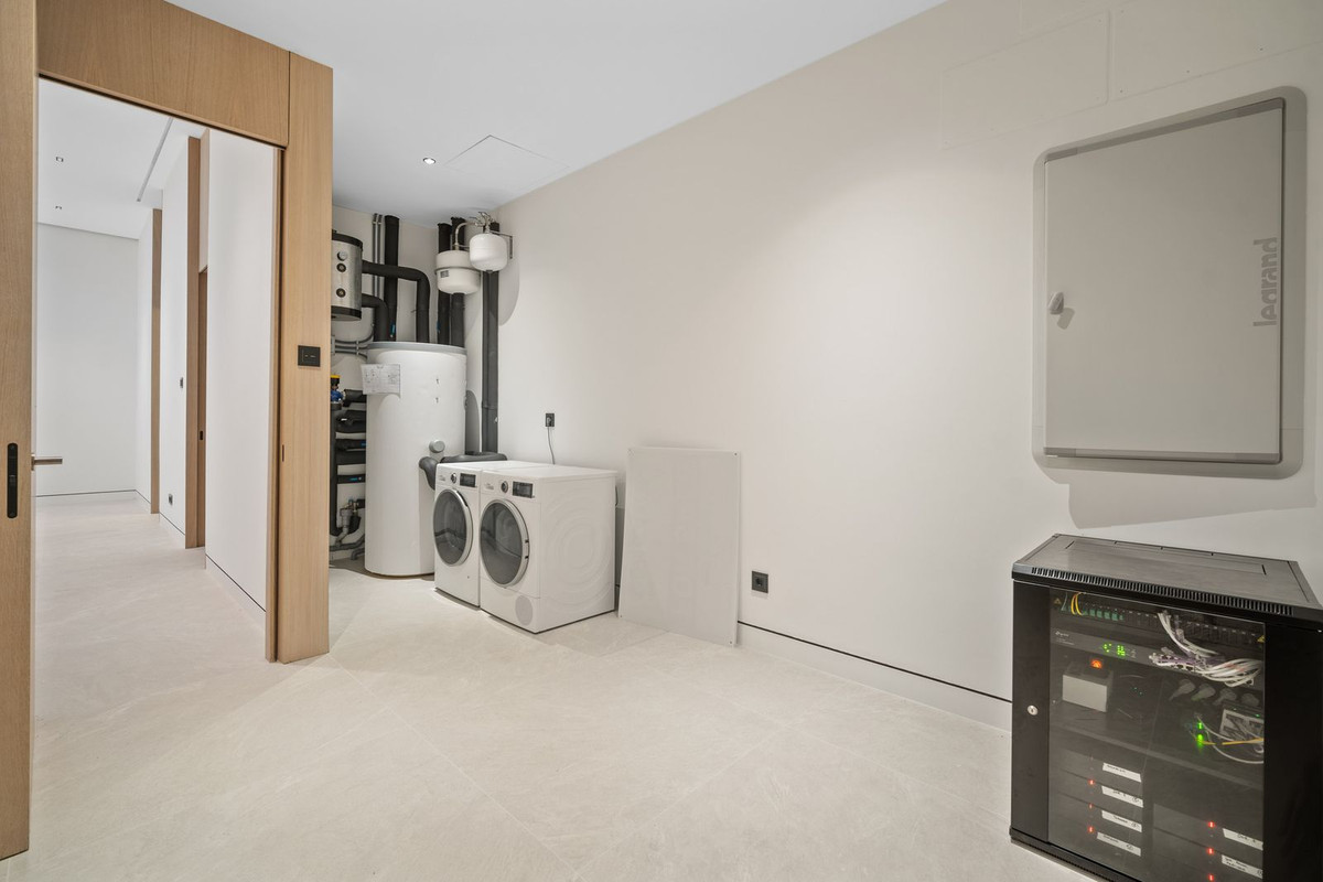 Offering 4 levels of pure indulgence, this 4-bedroom property is flooded with natural light, seamlessly blending indoor and outdoor living spaces. The floor-to-ceiling windows reveal breathtaking views of the gardens and swimming pool, while the roof terrace boasts a sublime pool, solarium, and even an outdoor cinema.