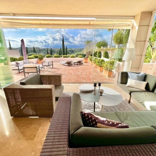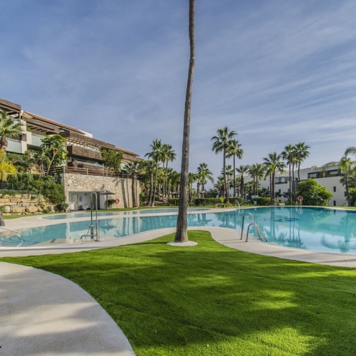 Elevated ground floor unit with fabulous terrace and garden space! The spacious back plot is facing southeast, and the front terrace and garden is facing southwest (with garden, mountain and a bit of sea view), so you always have areas with sun and shade, perfect to use all year. Access is easy, suitable for elderly, families with children, or pets. The inside is in good condition and of good layout, with the living areas separated from the sleeping areas. Good size bedrooms and bathrooms. Big walk-it closet, could be converted into a third bedroom. The apartment comes with 2 underground private parking spots, and a big storage room.The urbanisation is state of the art, with several swimming pools, beautiful garden with patio green, and 24h security. A must see!