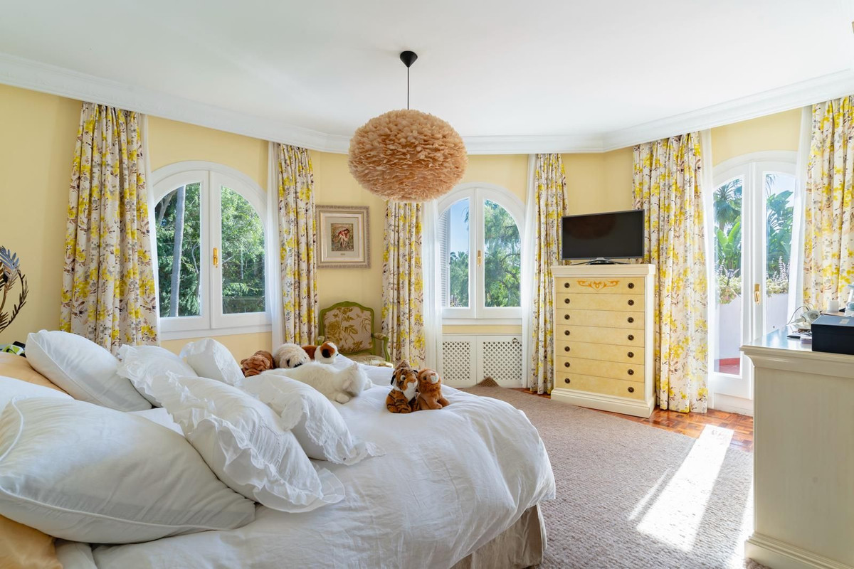 The villa is in a perfect state of preservation despite maintaining its aristocratic Marbella feel and offers a fully equipped and recently renovated kitchen, a separate dining room connected to a cosy living room with a large fireplace. A majestic classical style staircase leads to the first floor, where there are two spacious en suite bedrooms, one of them with access to a private terrace overlooking the garden and La Concha.