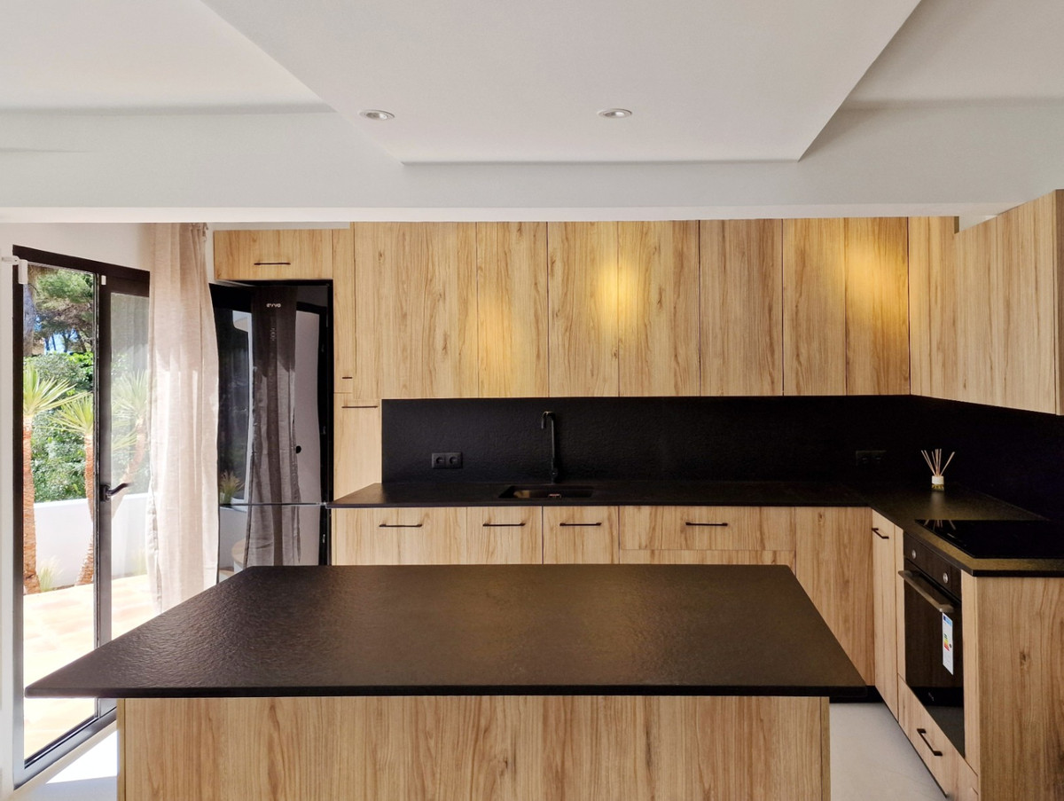 The open wooden kitchen is a perfect place to socialize, whether with friends or family. From here, you can enjoy spectacular views while sharing a meal or a conversation.