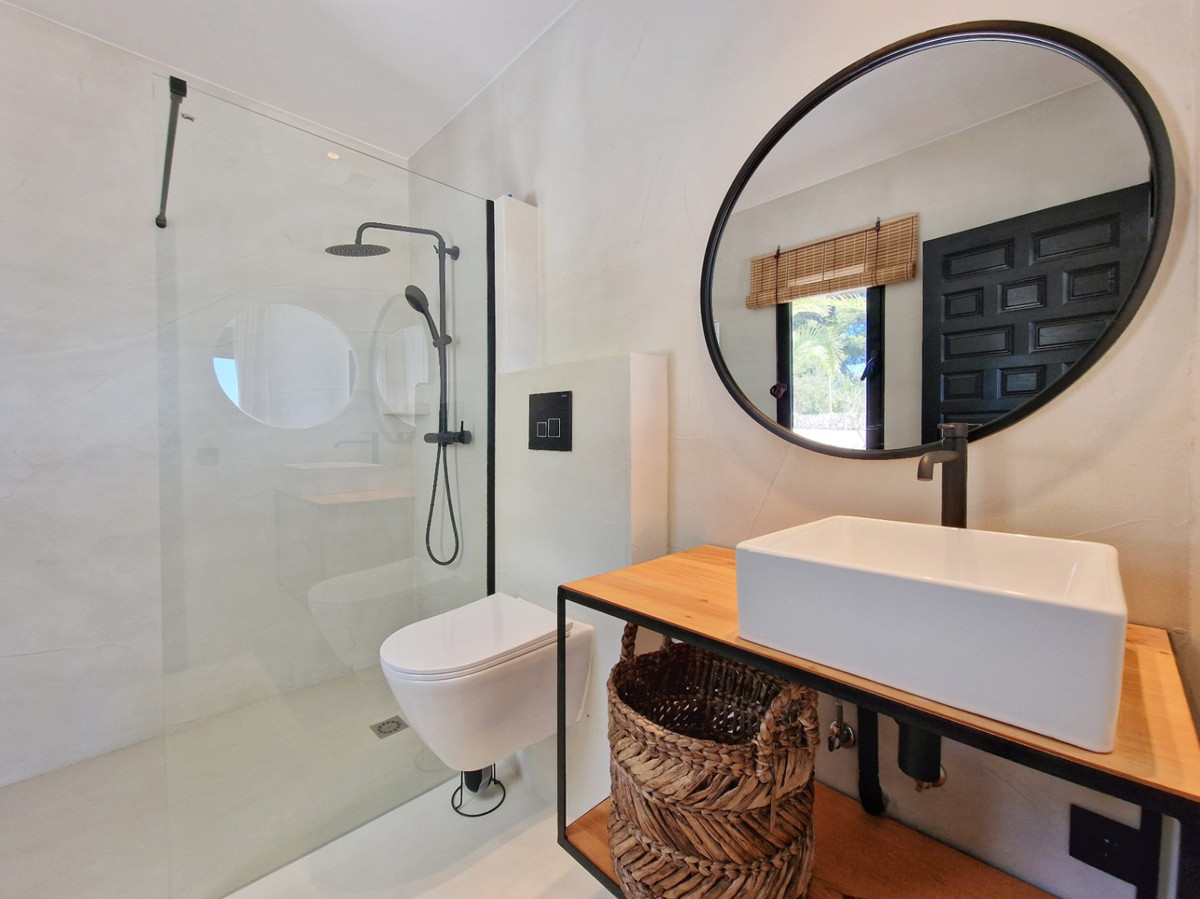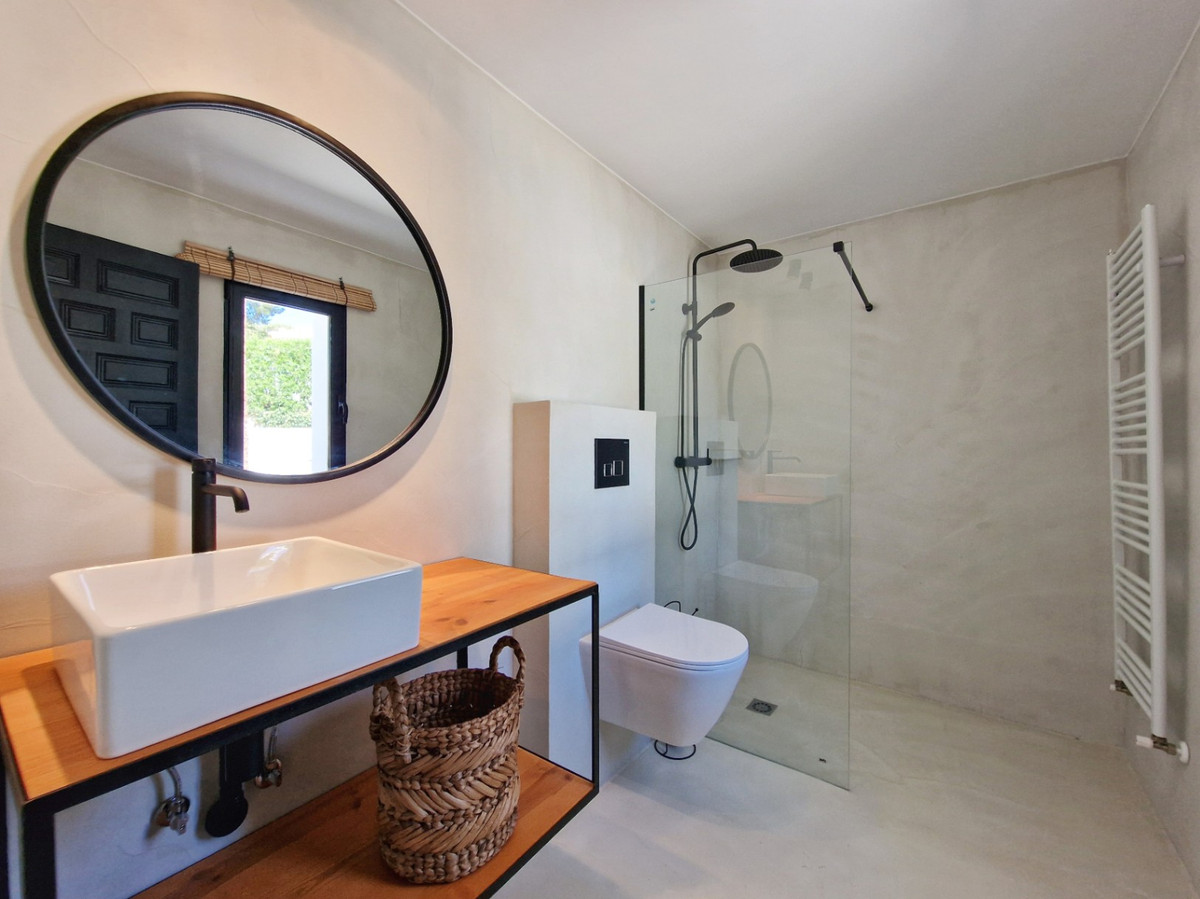 The villa features four spacious en-suite bedrooms, all located on the main floor and designed to offer maximum comfort and privacy. Each of these bedrooms is equipped with microcement floors, creating an elegant and modern continuity throughout the house. The brightness and careful design of these rooms ensure a perfect retreat for rest and relaxation.
