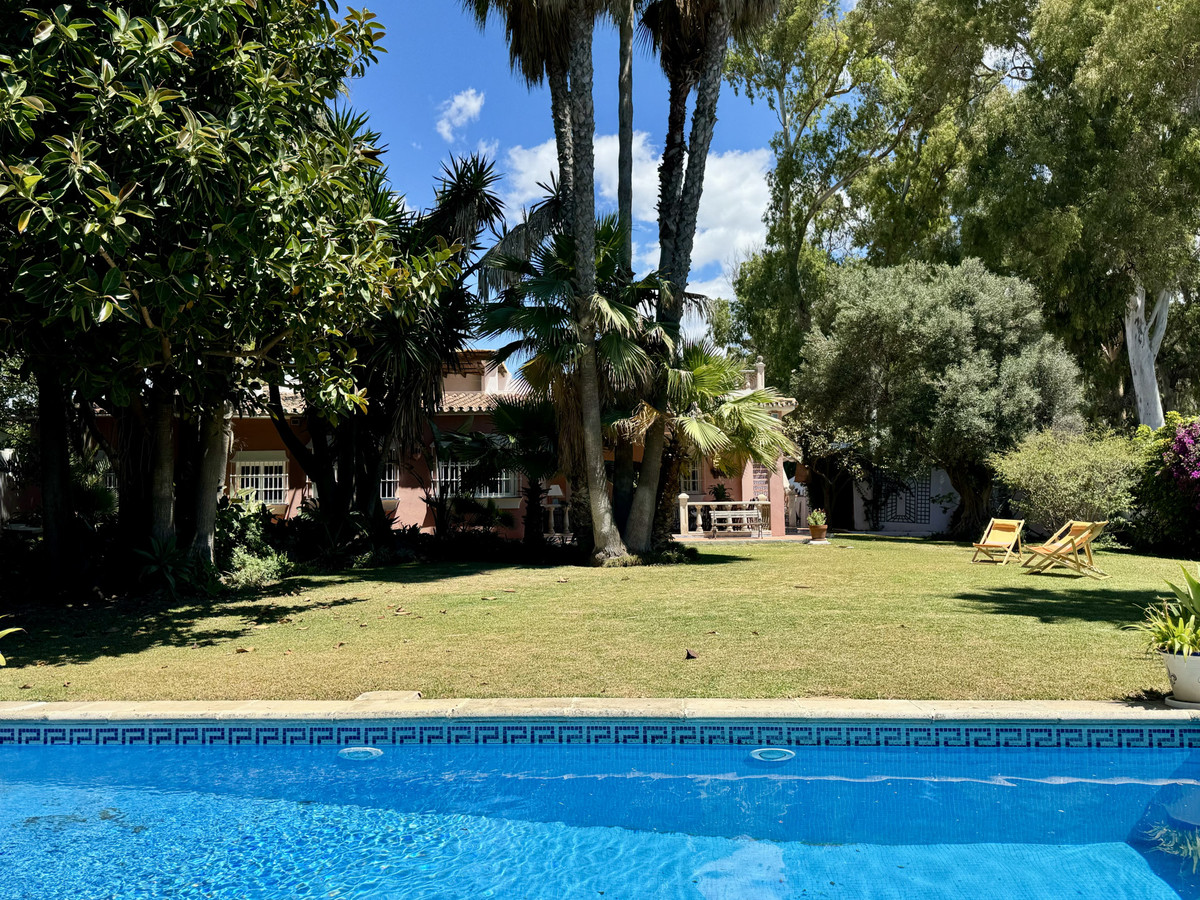 Beautiful family villa with a lot of charm located on the second line of the beach the well established urbanisation Linda Vista Baja, San Pedro de Alcántara. Built on a single floor, on a beautiful plot it has a very nice mature garden, with tropical plants and fruit trees. Due to its magnificent position, it is a very interesting renovation proyect. Just a few minutes walk to all kinds of services such as restaurants, international schools and shops. South facing, with beautiful views of the sea and to the mountains from the roof terrace. It consists of: cozy covered porch very privated with views to the garden. Spacious living room with dining area and fireplace, large fully equipped kitchen with breakfast area and laundry room. In total there are 6 double bedrooms with built-in cupboards + 1 maid´s bedroom and 3 bathrooms. The master bedroom is very spacious with its en-suite bathroom and office. Maid's room with shower room. On the East side of the house, there is a very cozy patio, ideal as a summer dining room for the whole family covered with awnings. Private garage and outdoor parking area for several cars. Air-conditioning. Solar panels.