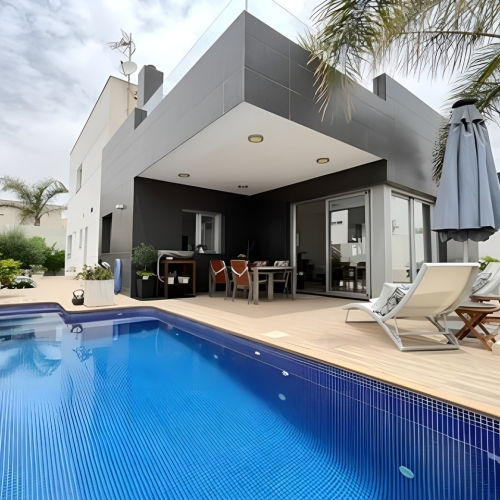 A lovely modern 4 bedroom 2 bathroom Villa with its own private pool. The property has been modernised to a high standard and is perfect for holidays or permanent living. A high wall and electric gates keep the 350m2 garden private. The garden is tiled for low maintenance with storage sheds to the rear, a gazebo and outside seating to rear by pump house, a sun terrace and dining table to the front, security front door and grills. On the inside the kitchen is a large modern fitted open plan style, and leads to the living room. There is a ground floor bathroom has a walk in shower. The two ground floor bedrooms have fitted wardrobes, one has a double bed the other two singles beds. There is a storage cupboard in the living room and another under the stairs. On the first floor are two more bedrooms, both having doors to the solarium sun balcony and en-suite shower room. The property also benefits from air conditioning and ceiling fans. The property is a 5 minuet drive to the blue flag white sandy beaches or several championship golf courses.