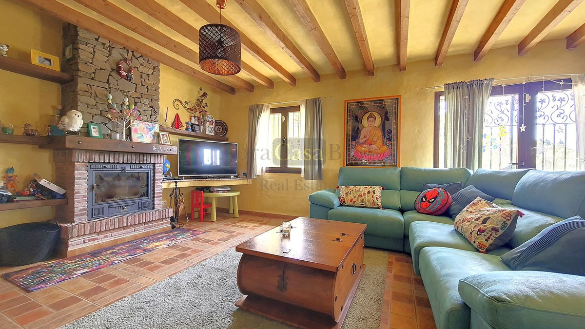 Upon entering, one immediately notices the warm and rural atmosphere. The typical Andalusian wooden doors are specially made to measure. The stylish tiled floor is of very good quality and the nice wooden beamed ceilings complete the picture. On the ground floor is a bathroom with shower and toilet. Next to it is a large storage room for the washing machine, among other things. Further down, at the end of the hallway, is a spacious bedroom currently used as a children's playroom. To the right of the hall, you enter the living/dining area with open kitchen, which is fully equipped. There is a large fireplace in this room. The glass patio doors in the middle of the room overlook the terrace at the side of the house.