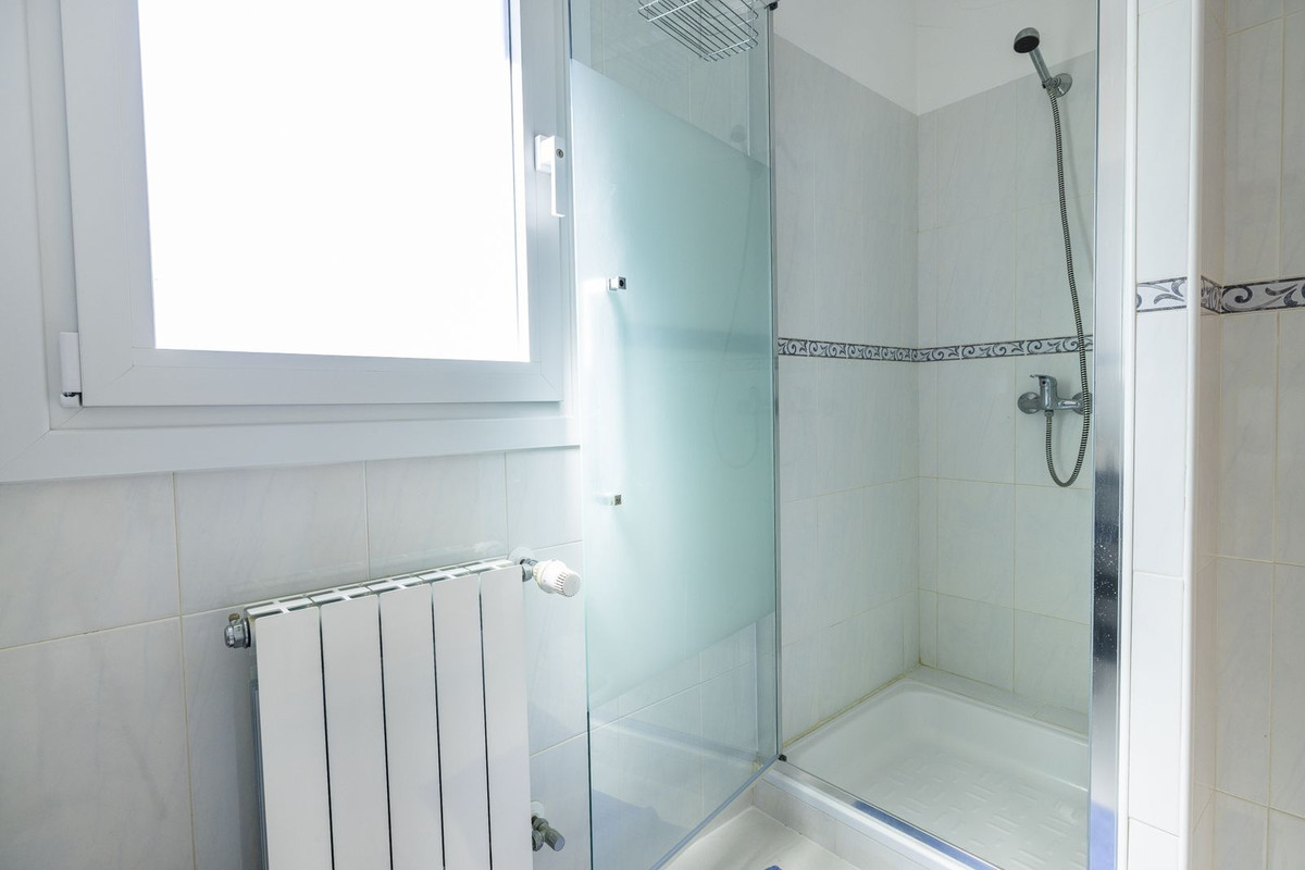 - On the ground floor, you'll find a comfortable bedroom with en suite bathroom (shower, toilet, sink) and air conditioning.
