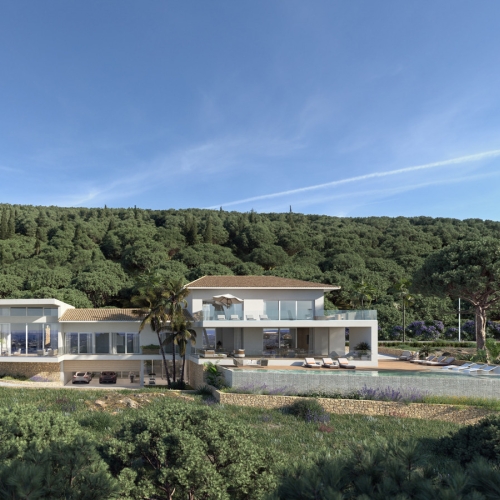 Luxurious modern villa among cork trees, featuring 4 ensuite bedrooms, an open-plan kitchen, large living area, and extensive outdoor amenities.