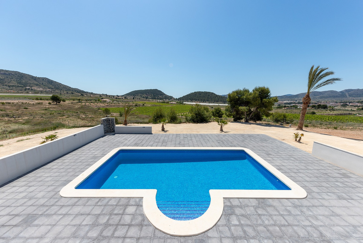 Magnificent newly built villa for an exceptional price! This fantastic villa is located in the La Romana area. The main house and other buildings add up to a total of 180 square meters built, located on a 10,000 m2 plot, of which approximately 3,500 m2 are fully fenced. You have the option of choosing the finished basement or a separate guest house. The price includes the 4 x 8 m2 pool and kitchen furniture of your choice of excellent quality. The main house consists of a large bright living room, a good size kitchen distributed as you wish, 3 bedrooms and 2 bathrooms. Also in the basement or guest house you will have 2 more bedrooms and 1 bathroom. The house has Air Conditioning.You will be the one who chooses aspects such as: kitchen furniture, tiles, flooring, doors, color of the windows, color of the façade, stone of the façade ... make your magnificent chalet your unique home!We are specialists in the Costa Blanca and Costa Calida specialising in the Alicante and Murcia Inland regions with a particular emphasis on Elda, Pinoso, Aspe, Elche and surrounding areas. We are an established, well known and trusted company that has built a solid reputation amongst buyers and sellers since we began trading in 2004. We offer a complete service with no hidden charges or surprises, starting with sourcing the property, right through to completion, and an unrivalled after sales service which includes property management, building services, and general help and advice to make your new house a home. With a portfolio of well over 1400 properties for sale, we are confident that we can help, so just let us know your preferred property, budget and location, and we will do the rest.